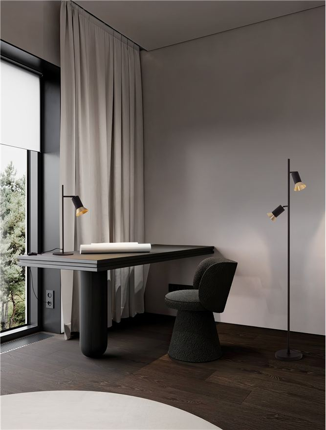 За стила и естетиката на обстановката в изключително висока степен допринасят, както цялостната визия, стилна изработка и елегантен дизайн на осветителното тяло, така също и използваните при изработката материали, като: алуминий с покритие с цвят оксидно злато, алуминий в черно, захранващ кабел 1.5m с щепсел и превключвател ON/OFF.