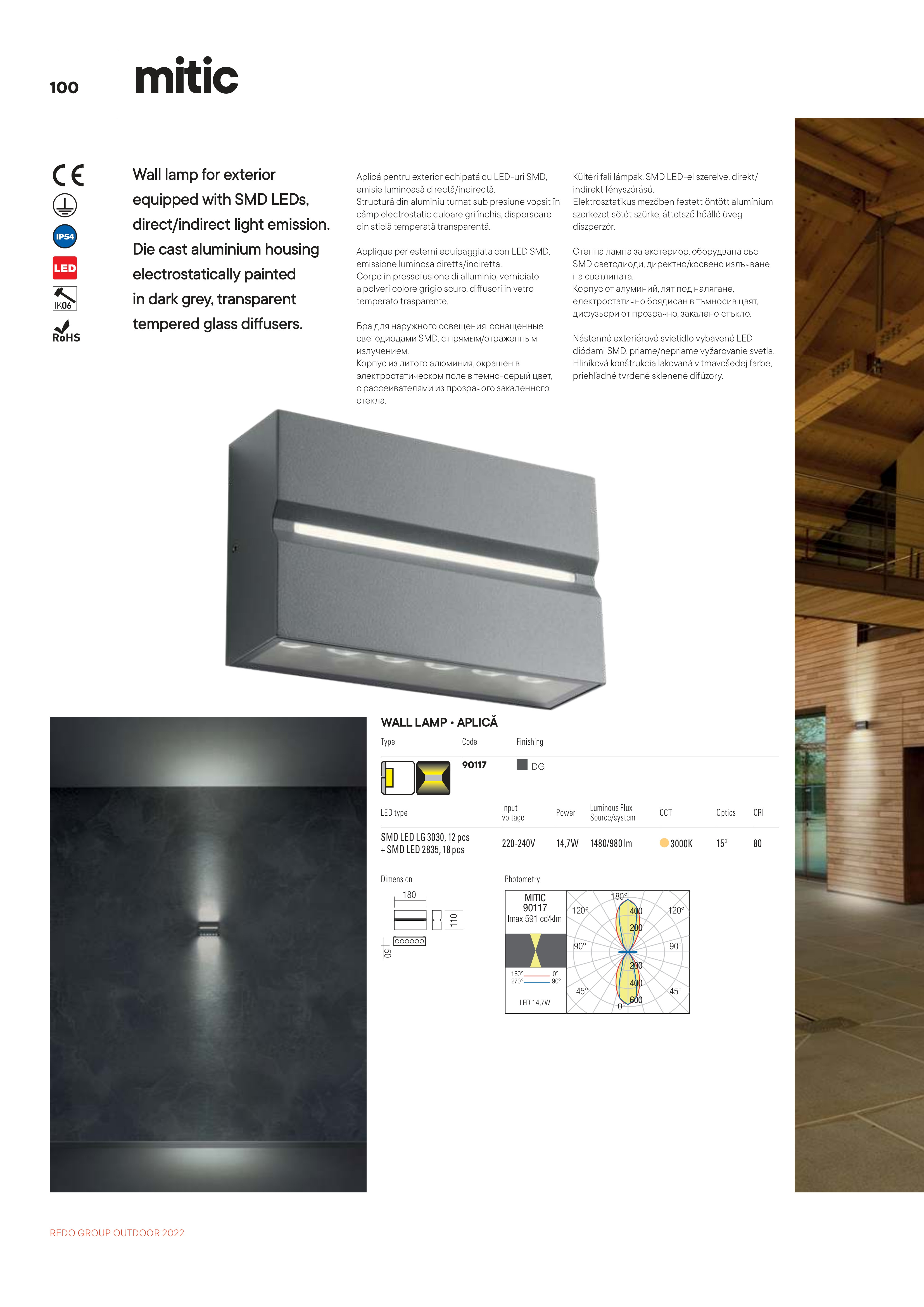 Лед аплик, външна лампа 90117 ще осигури комфорт и естетика във всяко помещение, в което се постави. Цялостната визия и дизайн на led лампата и вложените в изработката й материали, като алуминий отлят под налягане в тъмно сив цвят, дифузьори от прозрачно закалено стъкло, ще допринесат за един неповторим стил. Благодарение на дългогодишния опит в производството на лед осветление, качествените материали и строгия контрол на качеството на изработка на дизайнерската линия Redo Outdoor на производителя Redo (Румъния), 90117 е на високо европейско ниво.