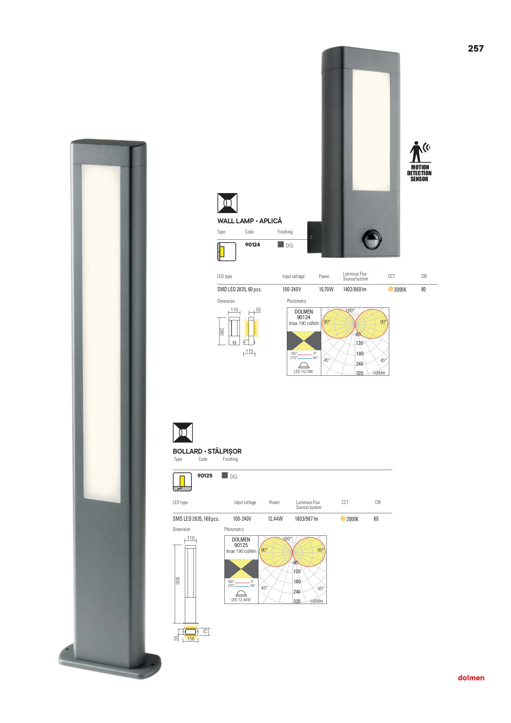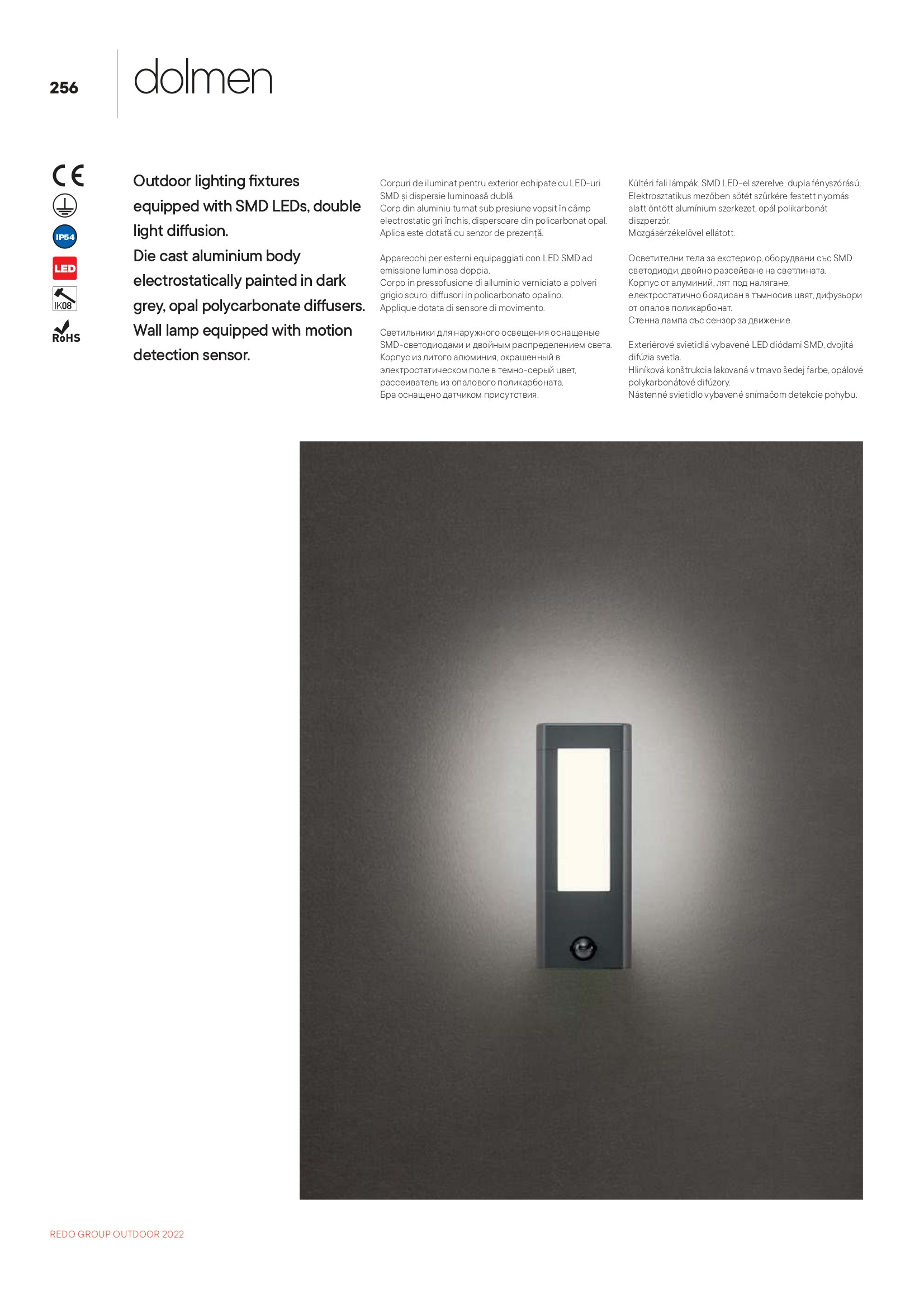 Осветителното тяло 90125 ще осигури комфорт и естетика във всяко помещение, в което се постави. Цялостната визия и дизайн на лампата и вложените в изработката й материали, като отлят под налягане алуминий в тъмно сив цвят, дифузери от полимер в цвят бял опал, двойно разсейване на светлината - пряко и непряка, сензор за движение, ще допринесат за един неповторим стил. Благодарение на дългогодишния опит, качествените материали и строгия контрол на качеството на изработка на дизайнерската линия Redo Outdoor на производителя Redo (Румъния), 90125 е на високо европейско ниво.