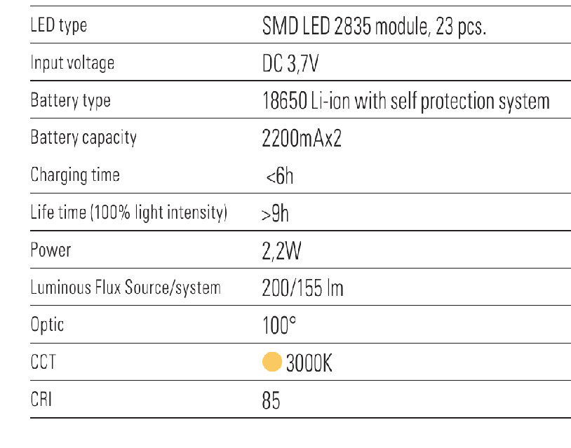 Включените в комплекта светлоизточници (2.2 W) са от клас LED (димеруеми), като светлинният им спектър е 3000 K. Тъй като LED лампите имат изключително дълъг живот и много ниска консумация, можете да бъдете сигурни, че това лед осветително тяло е правилна и дългосрочна инвестиция за Вашето осветление.
