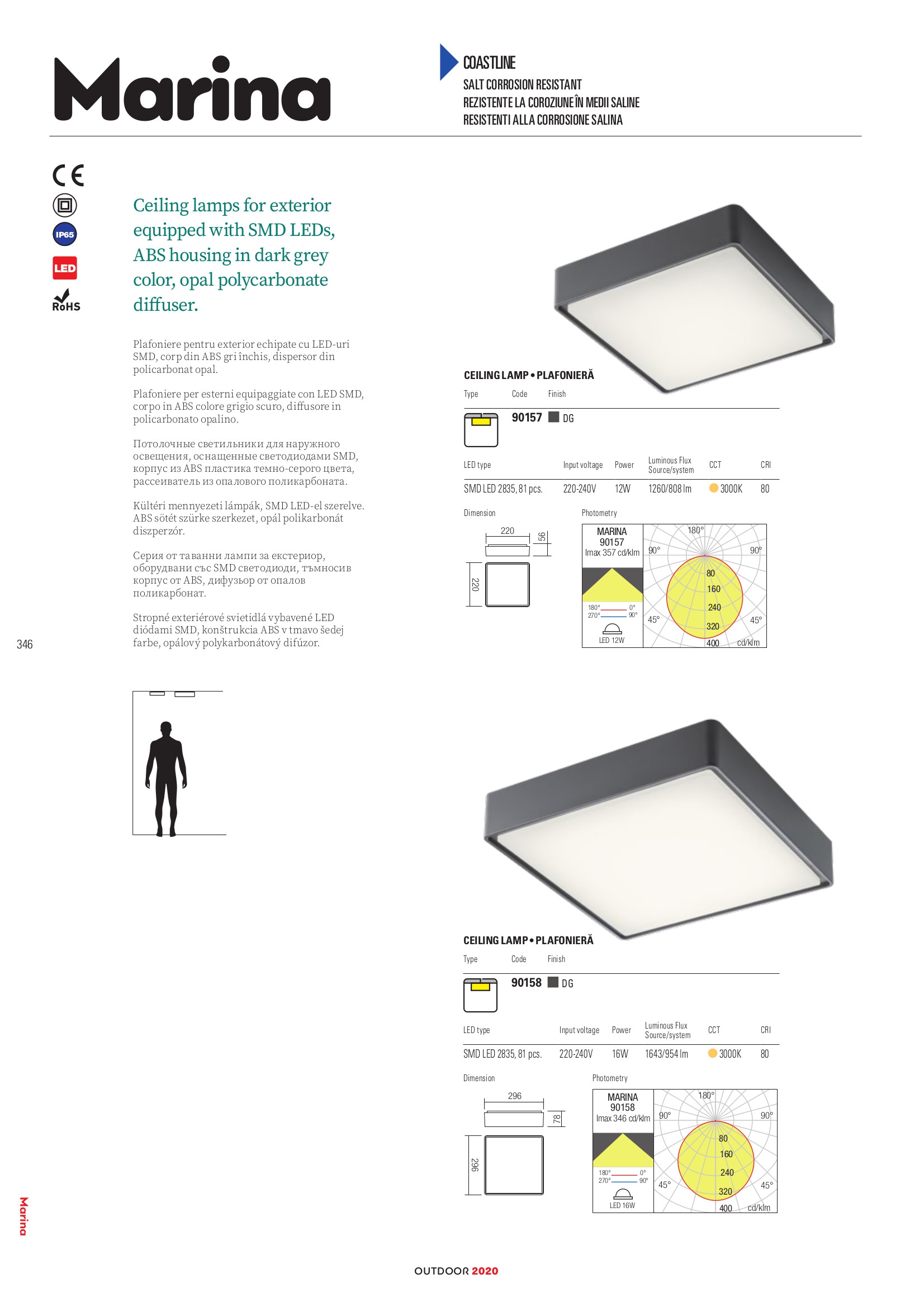 Осветителното тяло 90157 MARINA PL LED12W 3000K IP65 представлява плафон, аплик, външна лампа в съвременен стил. 90157 MARINA PL LED12W 3000K IP65 е от категорията осветителни тела и е подходящо за осветяване на различни помещения и пространства като: всекидневна / хол, спалня, кухня, трапезария, коридор, антре, стълбище, офис, външно осветление, фасадно осветление.