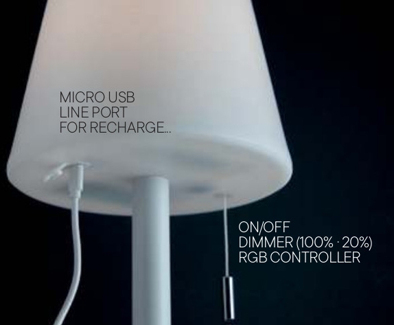 корпус от алуминий и стомана в тъмно сиво, дифузер от полимер в опалово бяло, ключ ON/OFF, димер 20-100%, RGB контролер, Li-ion батерия 4400mA със защита от претоварване, микро USB порт, време за пълно зареждане 6h, време на работа до 6h