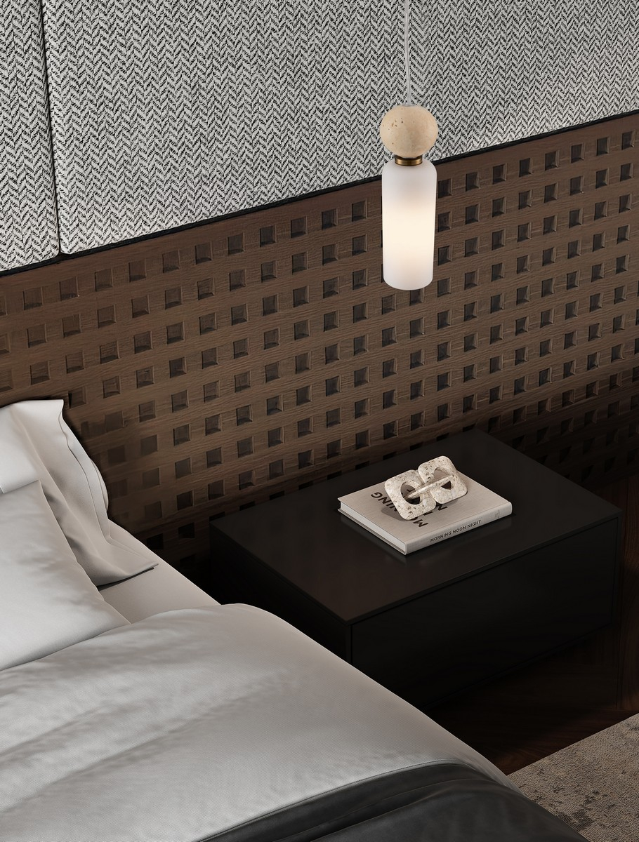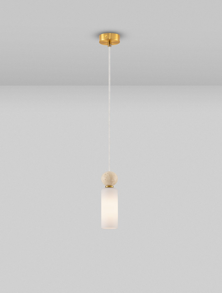 камък травертин, стъкло в цвят опал, метал с покритие с цвят гланцово матирано злато