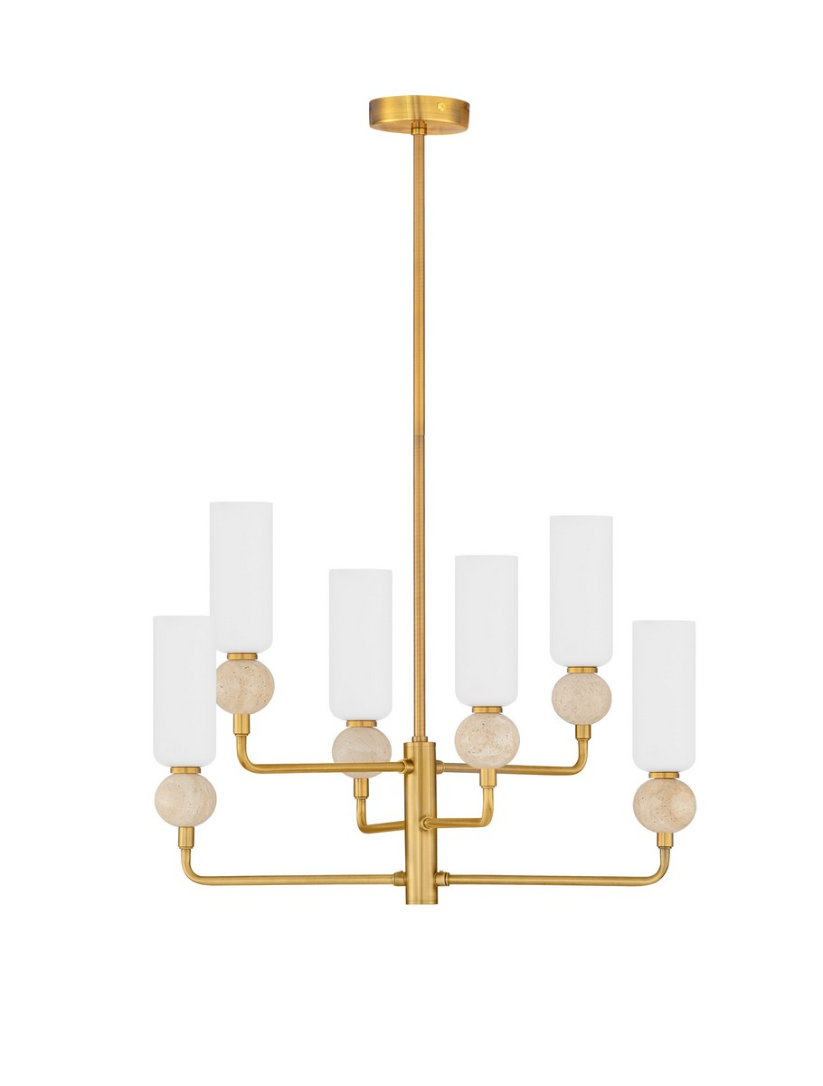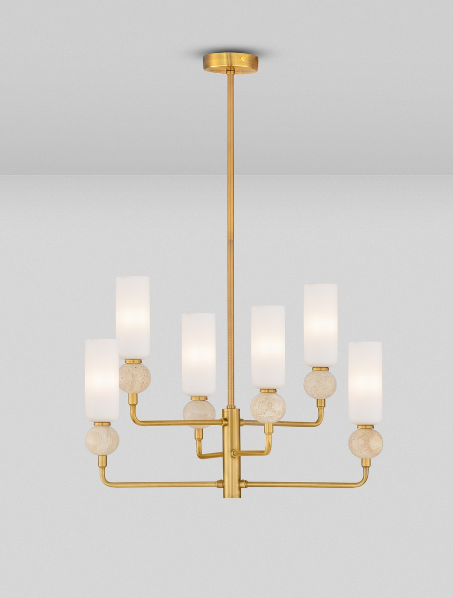 камък травертин, стъкло в цвят опал, метал с покритие с цвят гланцово матирано злато