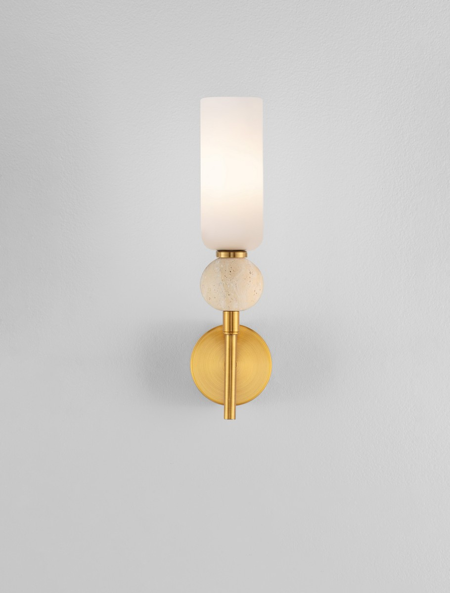 камък травертин, стъкло в цвят опал, метал с покритие с цвят гланцово матирано злато