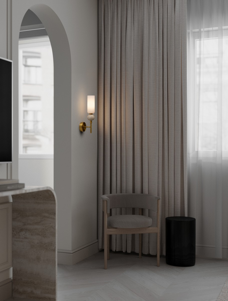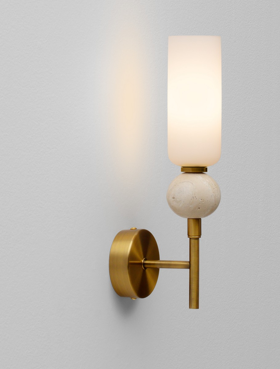 За стила и естетиката на обстановката допринасят, както цялостната визия и дизайн на осветителното тяло, така и вложените в изработката качествени материали, като: камък травертин, стъкло в цвят опал, метал с покритие с цвят гланцово матирано злато.