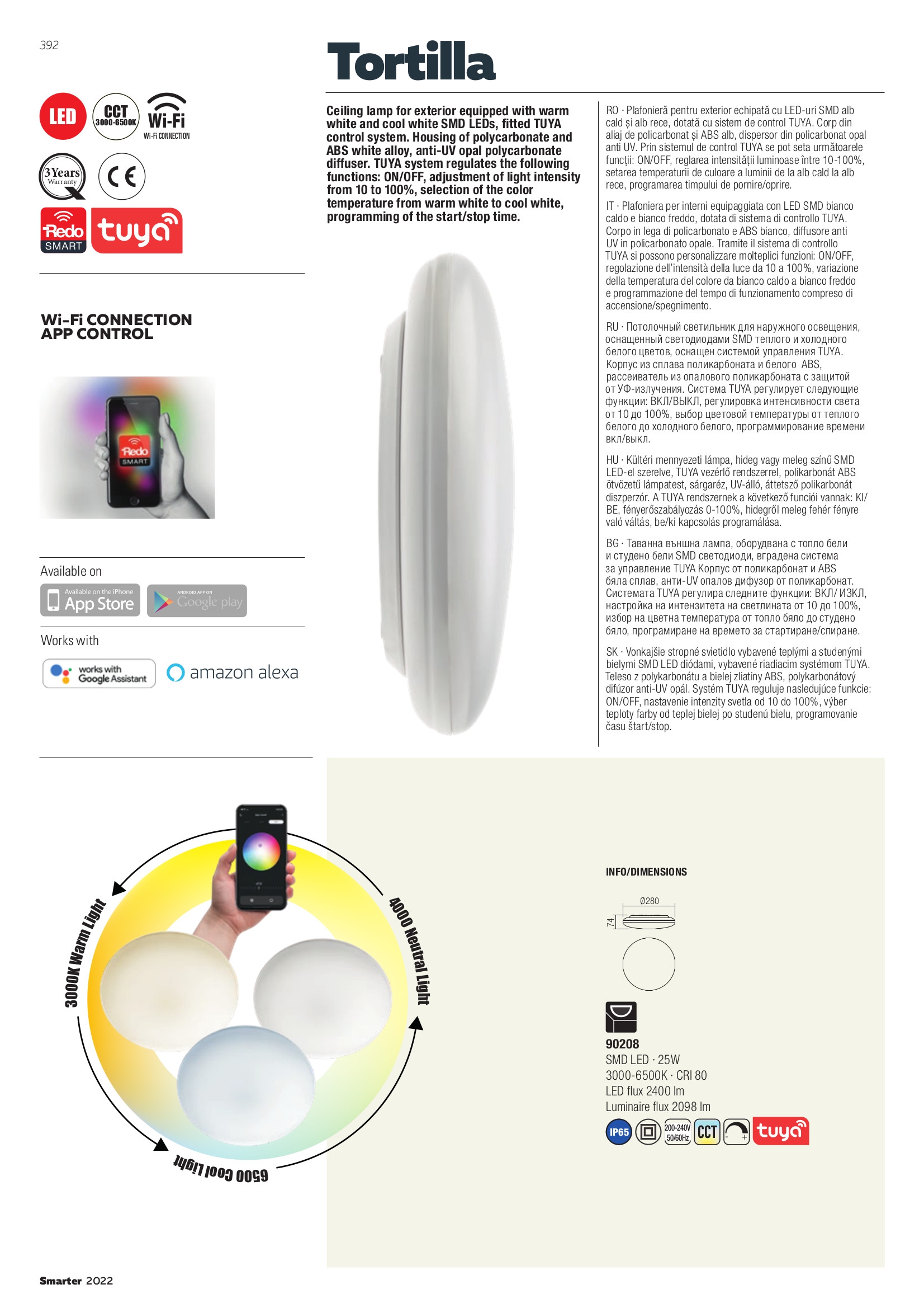 Осветителното тяло 90208 ще осигури комфорт и естетика във всяко помещение, в което се постави. Цялостната визия и дизайн на лампата и вложените в изработката й материали, като поликарбонатна сплав в бяло (ABS), анти-UV дифузер от опал поликарбонат, системата за управление TUYA, персонализира ВКЛЮЧВАНЕ / ИЗКЛЮЧВАНЕ, регулиране на интензитета на светлината, промяна на цветната температура, програмиране на времето за работа, ще допринесат за един неповторим стил. Благодарение на дългогодишния опит, качествените материали и строгия контрол на качеството на изработка на дизайнерската линия Redo Smarter на производителя Redo (Румъния), 90208 е на високо европейско ниво.