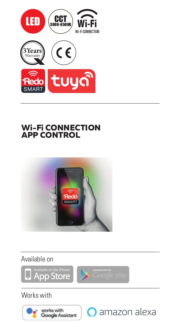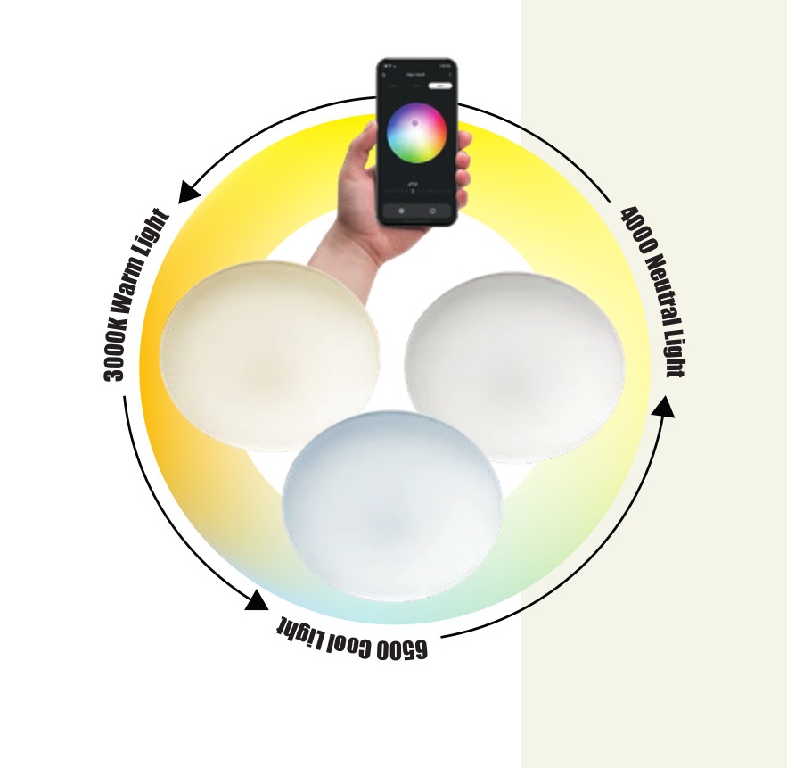 поликарбонатна сплав в бяло (ABS), анти-UV дифузер от опал поликарбонат, системата за управление TUYA, персонализира ВКЛЮЧВАНЕ / ИЗКЛЮЧВАНЕ, регулиране на интензитета на светлината, промяна на цветната температура, програмиране на времето за работа