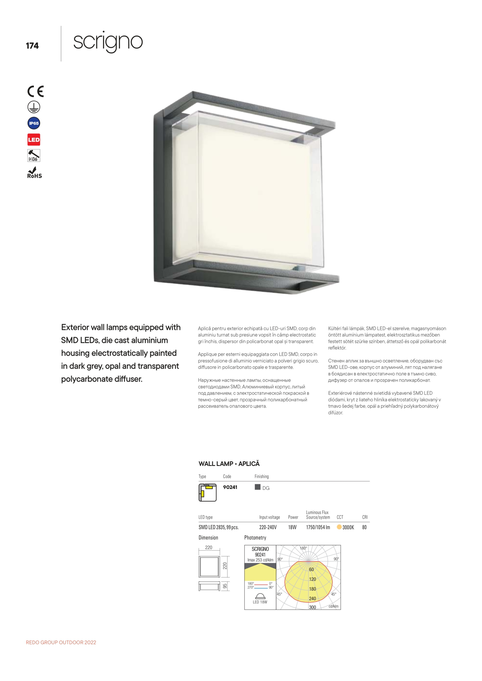 Осветителното тяло 90241 ще осигури комфорт и естетика във всяко помещение, в което се постави. Цялостната визия и дизайн на лампата и вложените в изработката й материали, като алуминий лят под налягане с електростатично нанесено покритие в тъмно сив цвят, дифузьор от сопалово бял и прозрачен поликарбонат, ще допринесат за един неповторим стил. Благодарение на дългогодишния опит, качествените материали и строгия контрол на качеството на изработка на дизайнерската линия Redo Outdoor на производителя Redo (Румъния), 90241 е на високо европейско ниво.
