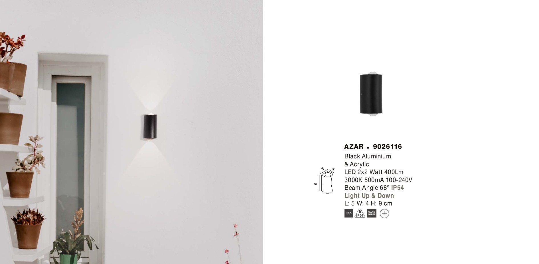 Осветителното тяло 9026116 представлява аплик, външна лампа в съвременен стил. 9026116 е от категорията осветителни тела и е подходящо за осветяване на различни помещения и пространства като: външно осветление, фасадно осветление.