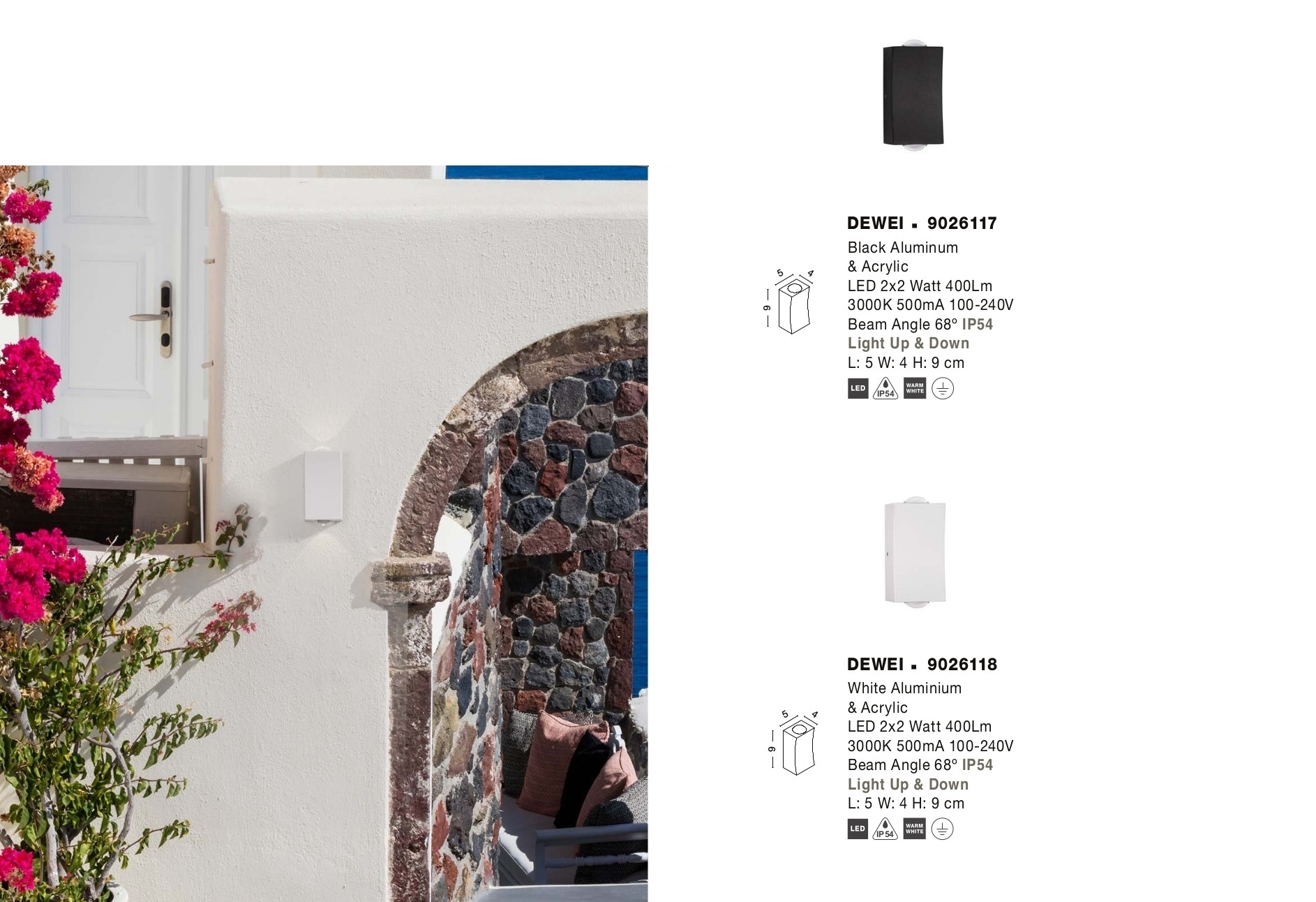Осветителното тяло 9026118 представлява лед аплик, външна лампа в съвременен стил. 9026118 е от категорията и е подходящо за осветяване на различни помещения и пространства като: външно осветление, фасадно осветление.