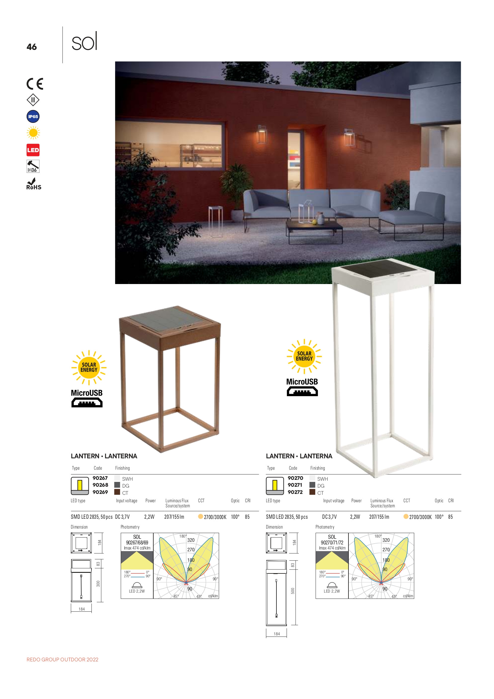 Лед лампион / правостояща лампа, външна лампа 90270 ще осигури комфорт и естетика във всяко помещение, в което се постави. Цялостната визия и дизайн на led лампата и вложените в изработката й материали, като лят алуминий в матово бяло, прозрачен полимер, ключ ON/OFF, димер 5-100% с памет, промяна на цветната температура 2700-3000K, хибридно зареждане - соларен панел и Li-ion батерия 2 х 2200mA, микро USB порт, адаптер 100-240VAC/5VDC, 1A с кабел 1.5m, ще допринесат за един неповторим стил. Благодарение на дългогодишния опит в производството на лед осветление, качествените материали и строгия контрол на качеството на изработка на дизайнерската линия Redo Outdoor на производителя Redo (Румъния), 90270 е на високо европейско ниво.