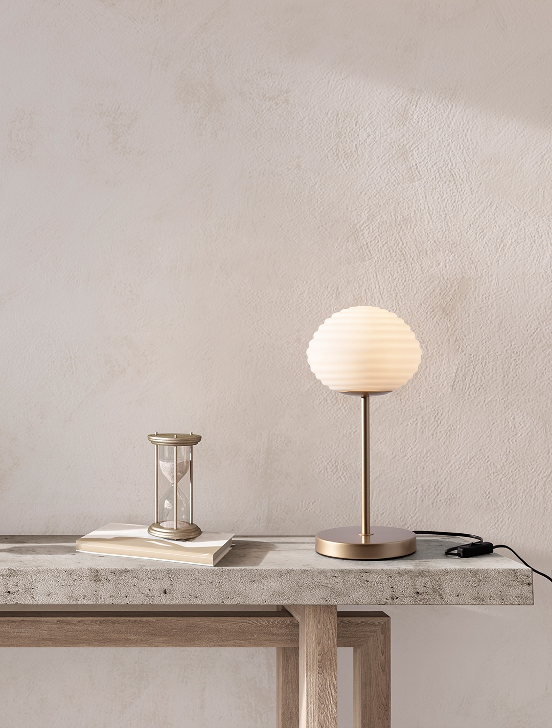 метал в цвят матово злато, дифузер от млечно бяло структурирано стъкло, захранващ кабел 1.9m и ключ ON/OFF