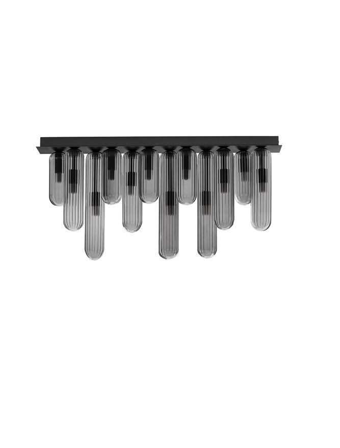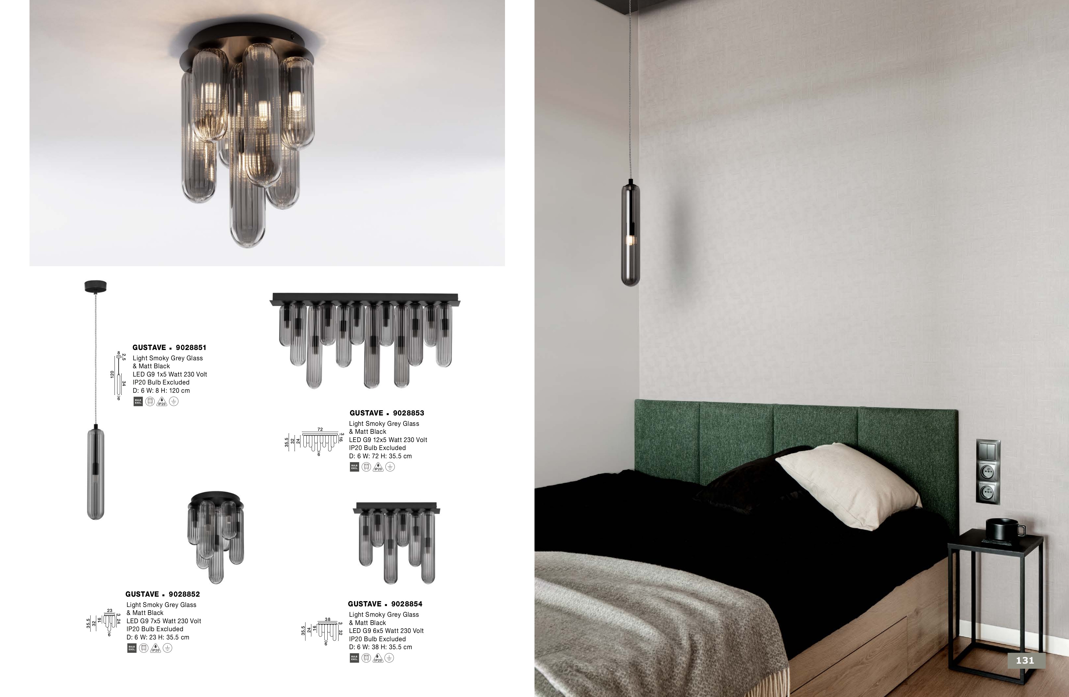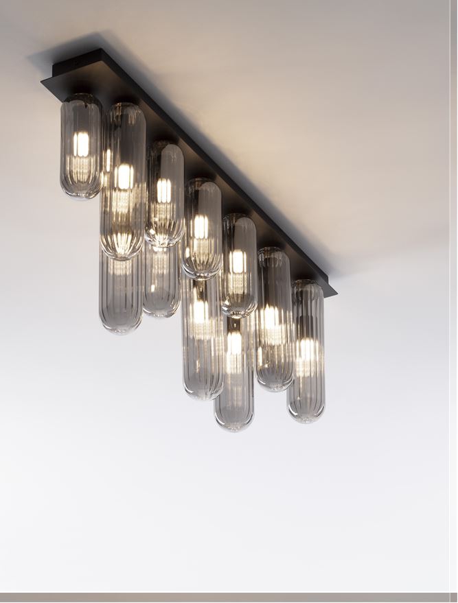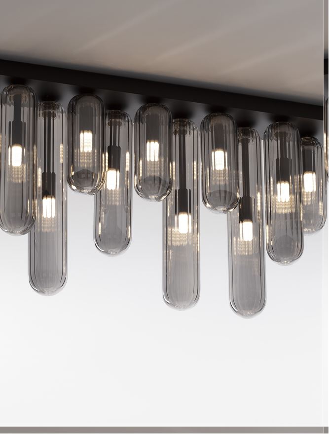 За стила и естетиката на интериора в изключително висока степен допринасят, както цялостната визия и дизайн на осветителното тяло, така и вложените в изработката висококачествени материали, като светло сиво опушено стъкло, метал в матово черен цвят.