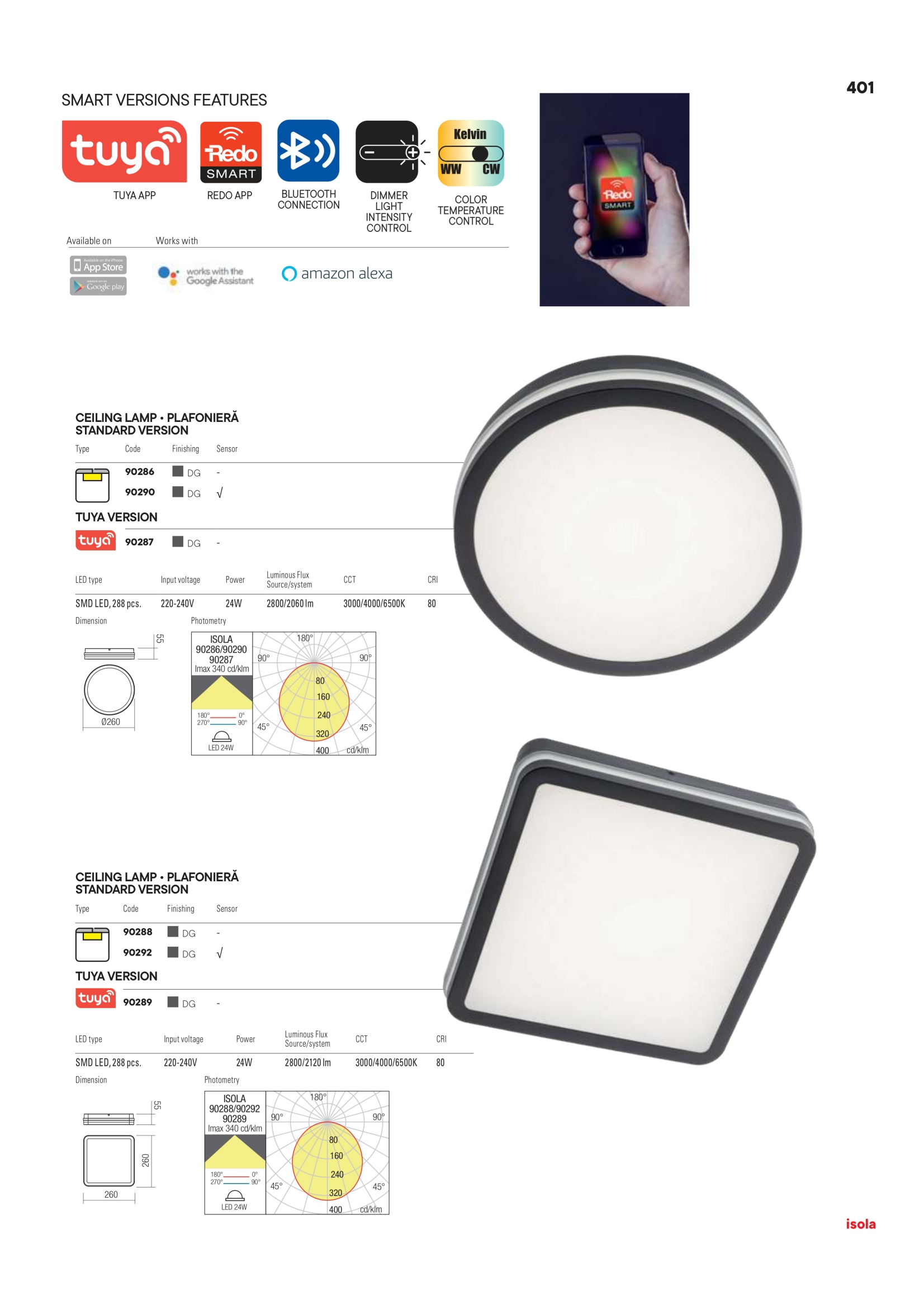 Лед плафон, външна лампа 90290 ще осигури комфорт и естетика във всяко помещение, в което се постави. Цялостната визия и дизайн на led лампата и вложените в изработката й материали, като тяло от стабилизиран полимер (ABS), устойчив на UV лъчи и морска (солена) корозия, превключвател на цветната температура 3000/4000/5000К, сензор за движение и здрач, дифузер от опалово бял поликарбонат, ще допринесат за един неповторим стил. Благодарение на дългогодишния опит в производството на лед осветление, качествените материали и строгия контрол на качеството на изработка на дизайнерската линия Redo Outdoor на производителя Redo (Румъния), 90290 е на високо европейско ниво.