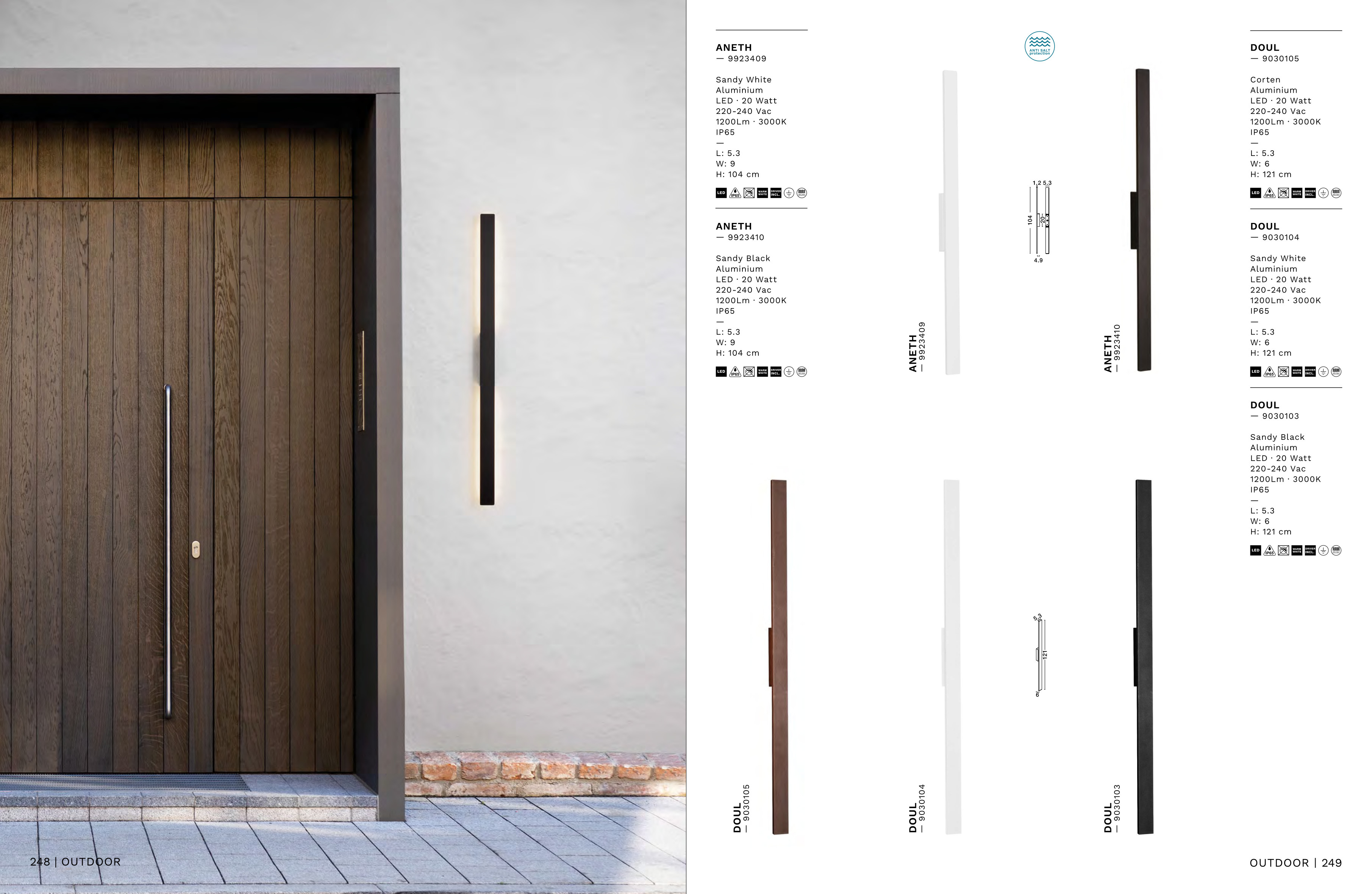 Осветителното тяло 9030104 представлява аплик, външна лампа в съвременен стил. 9030104 е от категорията осветителни тела и е подходящо за осветяване на различни помещения и пространства като: външно осветление, фасадно осветление.