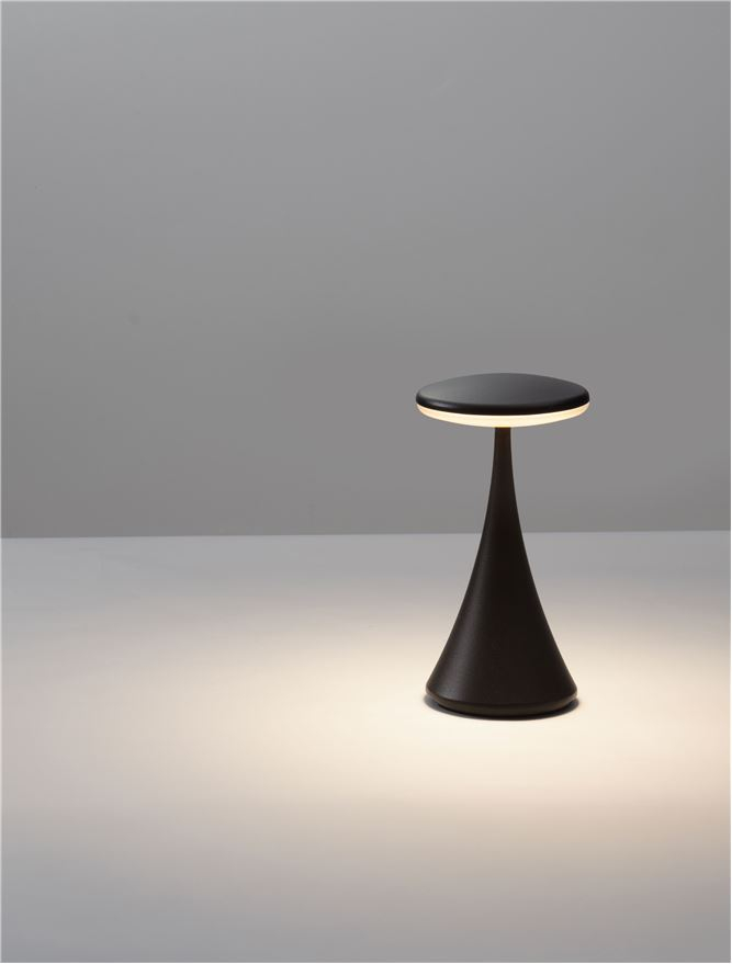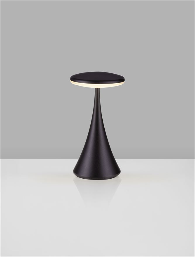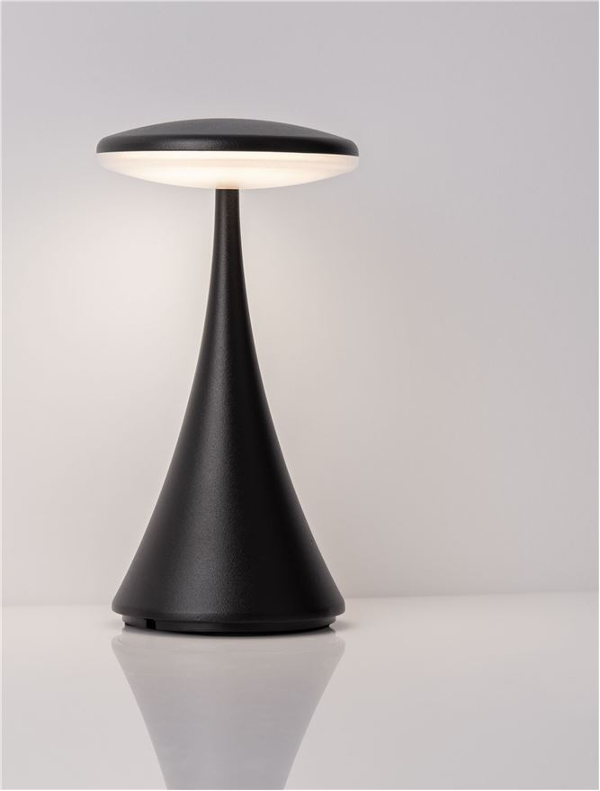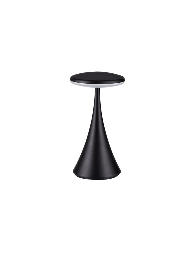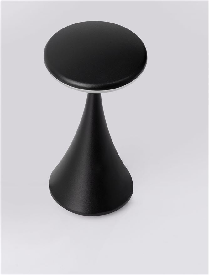 отлят под налягане алуминий в матово черен цвят, полимер със заскрежен ефект, зареждане чрез USB кабел, превключвател ON/OFF, димиране с докосване