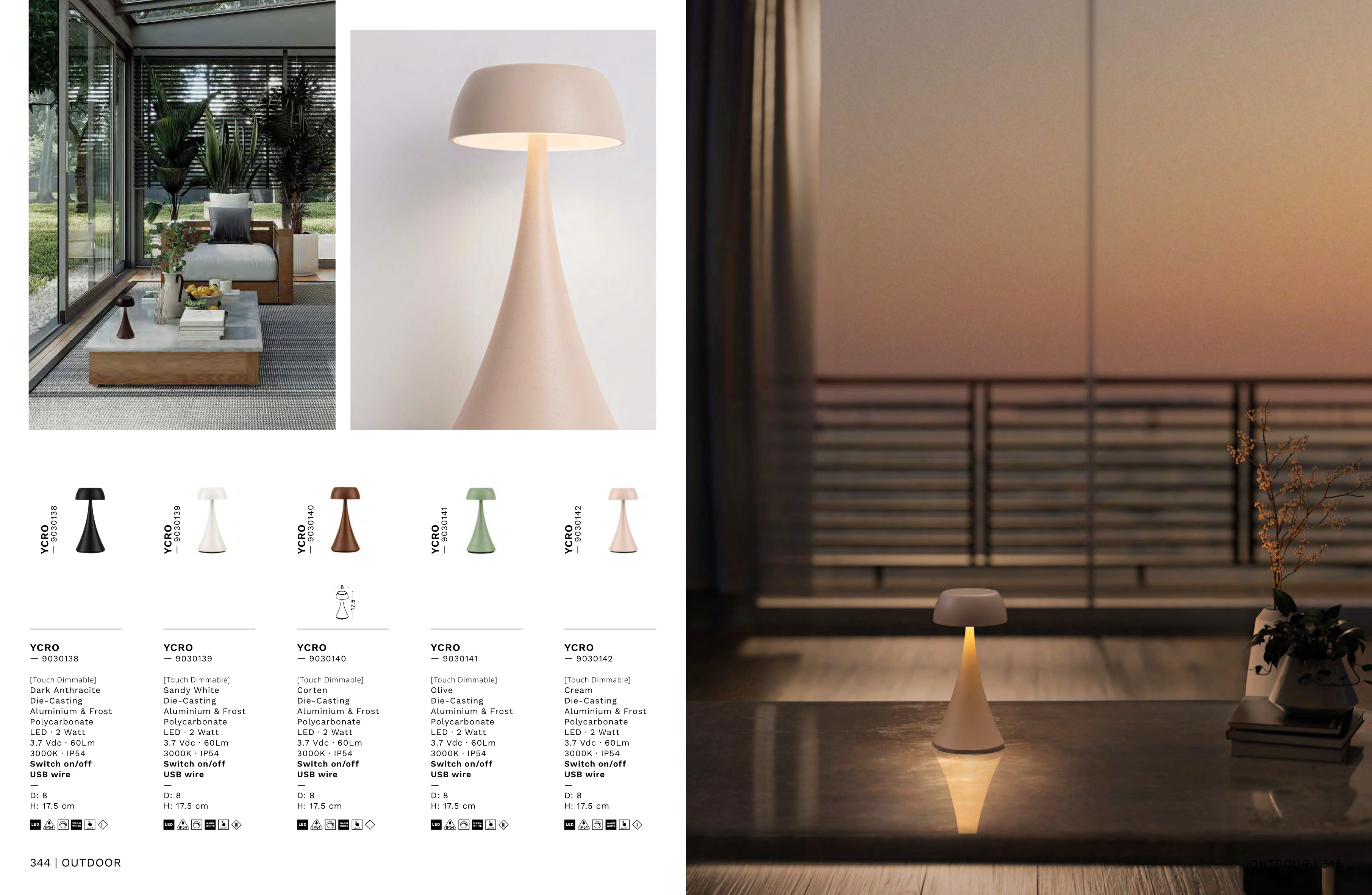 алуминий отлят под налягане в цвят крем, поликарбонат с ефект заскрежаване, димиране чрез докосване, 3.7 VDC, ключ ON/OFF, USB кабел