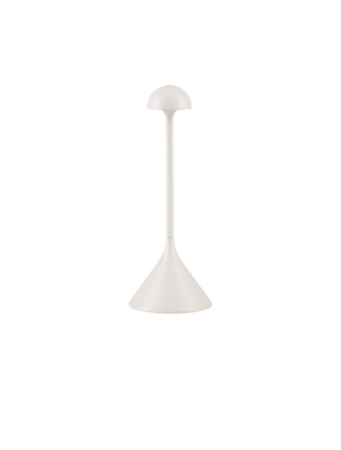 отлят под налягане алуминий в матово бял цвят, полимер със заскрежен ефект, зареждане чрез USB кабел, превключвател ON/OFF, димиране с докосване