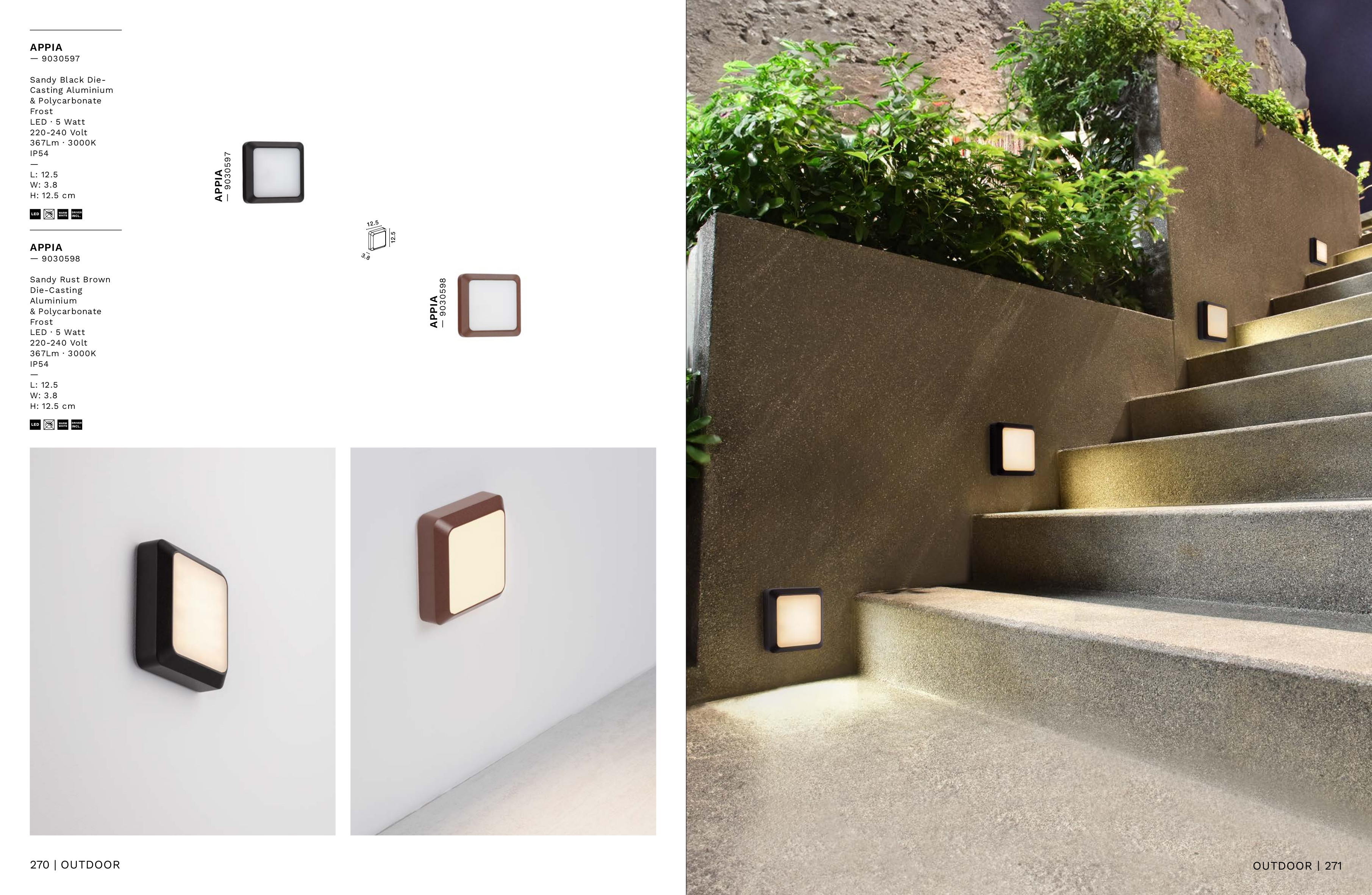 Осветителното тяло 9030598 представлява аплик, външна лампа в съвременен стил. 9030598 е от категорията осветителни тела и е подходящо за осветяване на различни помещения и пространства като: външно осветление, фасадно осветление.