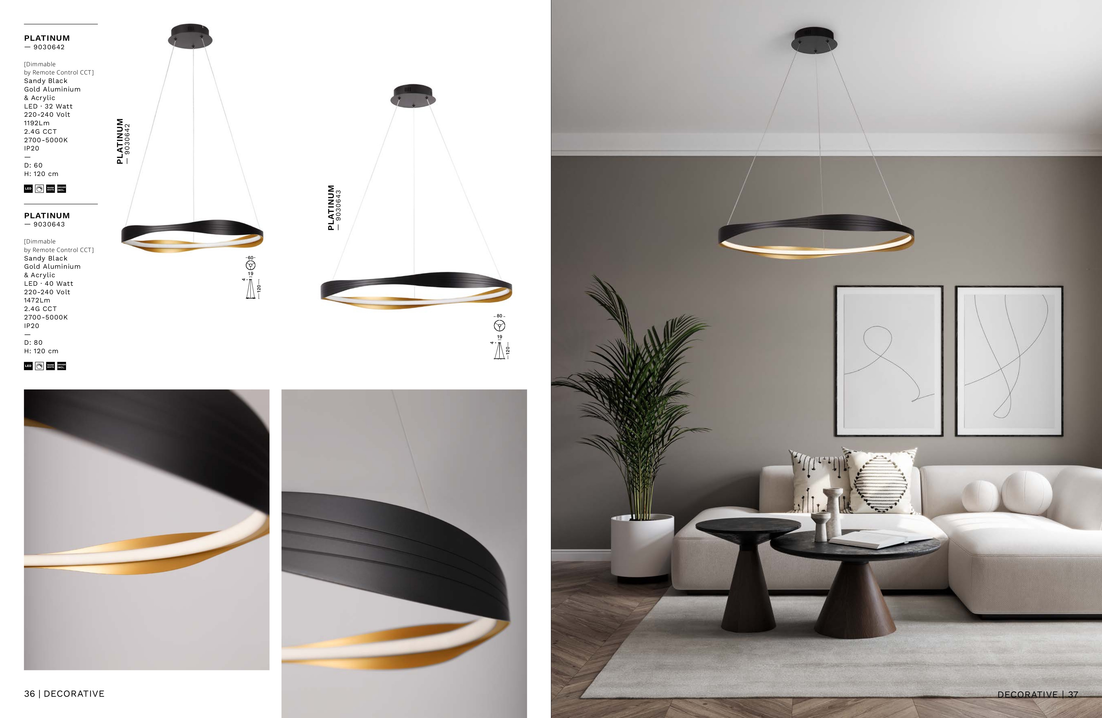 Осветителното тяло 9030643 ще осигури комфорт и естетика във всяко помещение, в което се постави. Цялостната визия и дизайн на лампата и вложените в изработката й материали, като алуминий в цвят злато и черно, полимер, смяна на ССТ и димиране с дистанционно, ще допринесат за един неповторим стил. Благодарение на дългогодишния опит, качествените материали и строгия контрол на качеството на изработка на производителя Nova-Luce (Гърция), 9030643 е на високо европейско ниво.