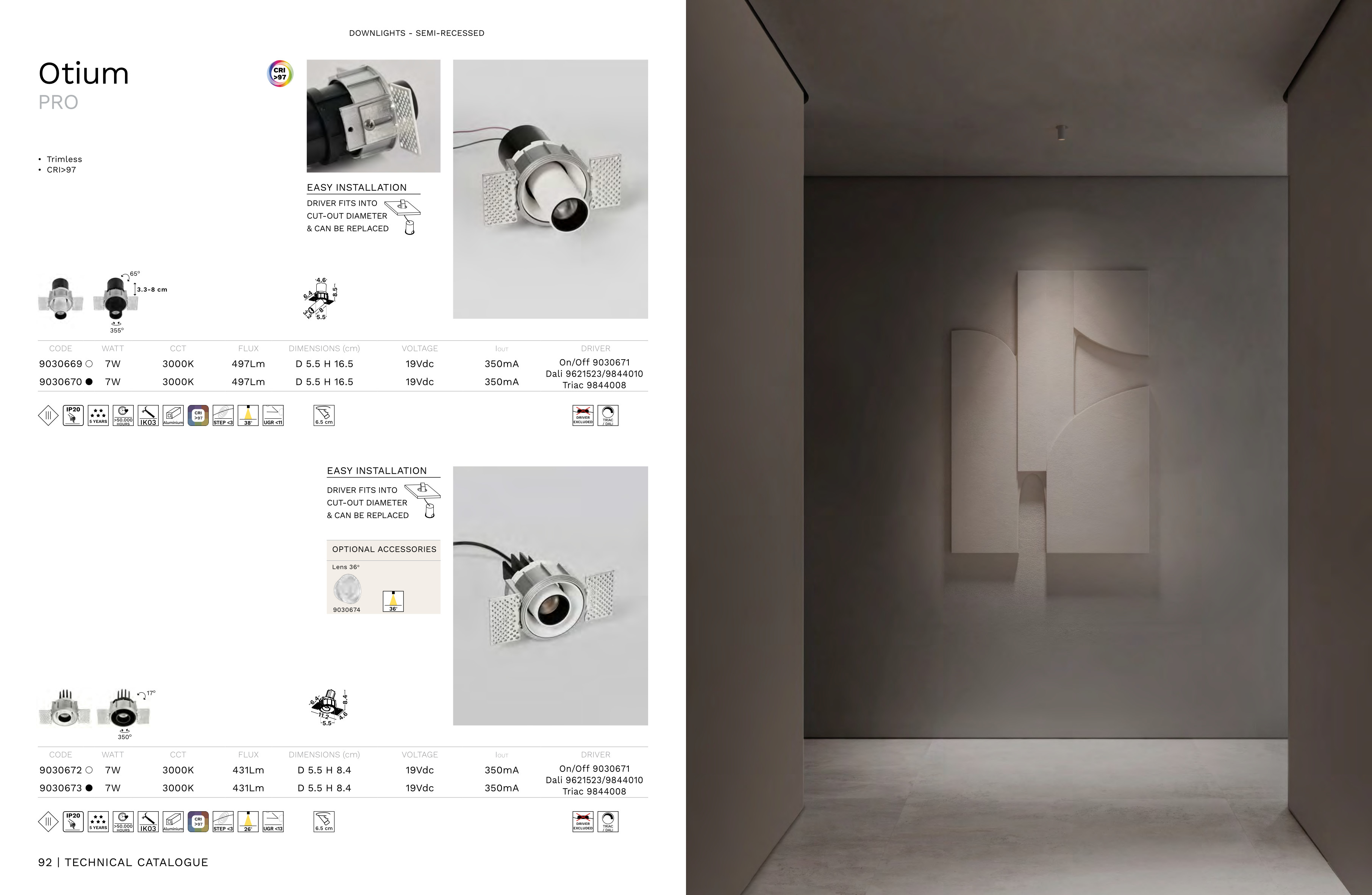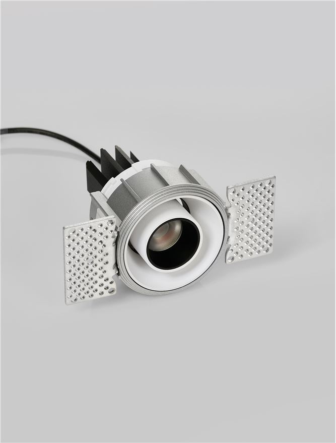 алуминий в бял цвят, без включен драйвър в комплекта, препоръчват се: On/Off 9030671 или Dali 9621523/9844010, CRI>97, ъгъл на лъча 26°, тялото може да се накланя и насочва до 17°