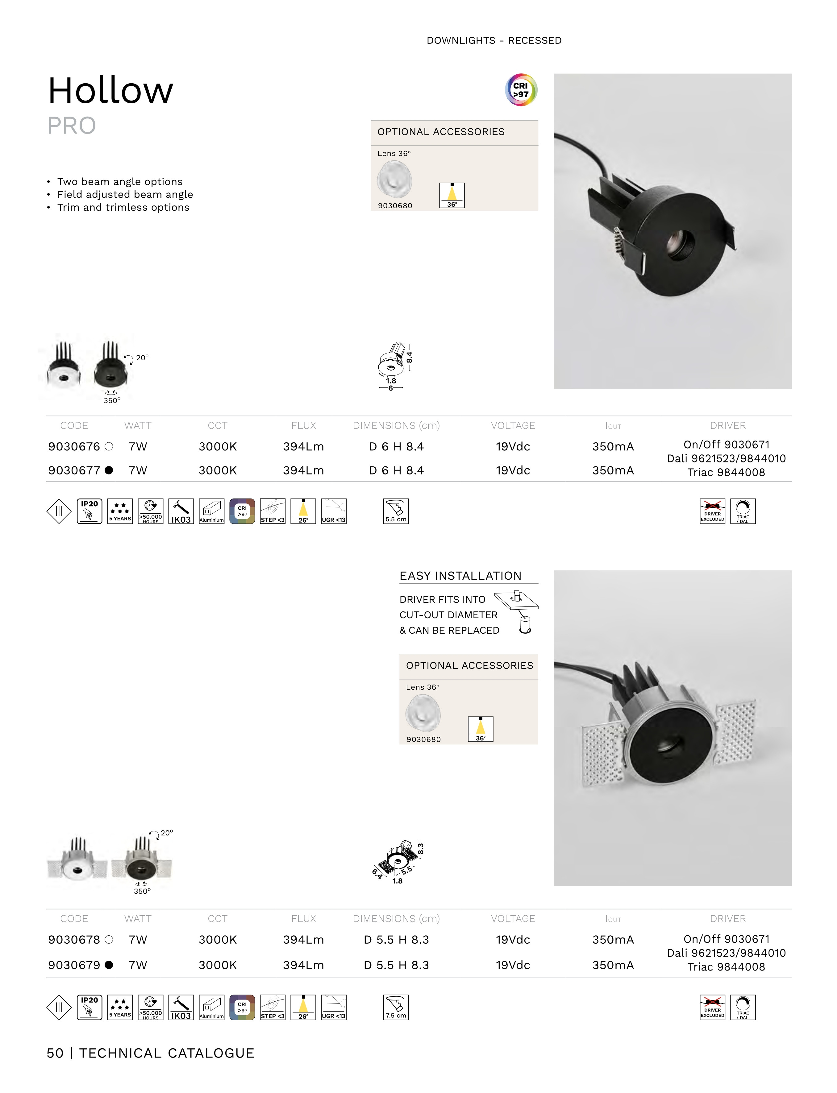 алуминий в бял цвят, без включен драйвър в комплекта, препоръчват се: On/Off 9030671 или Dali 9621523/9844010, CRI>97, ъгъл на лъча 26°, тялото може да се накланя и насочва до 20°