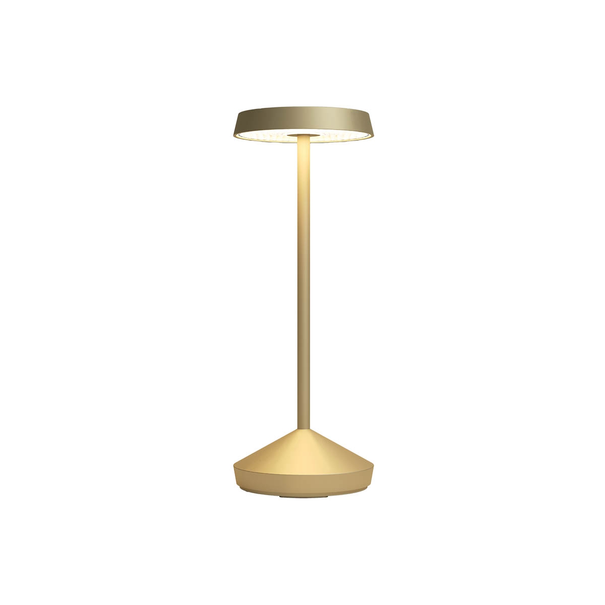 лят под налягане алуминий в цвят златен мат, ON/OFF ключ, димер 5-100%, смяна на цветната температура 2700-3000К, Li-ion батерия 2000mA х 2 със защита от презареждане, микро USB гнездо, кабел и адаптер 100-240VAC/5VDC, 1A, време на зареждане до 6h