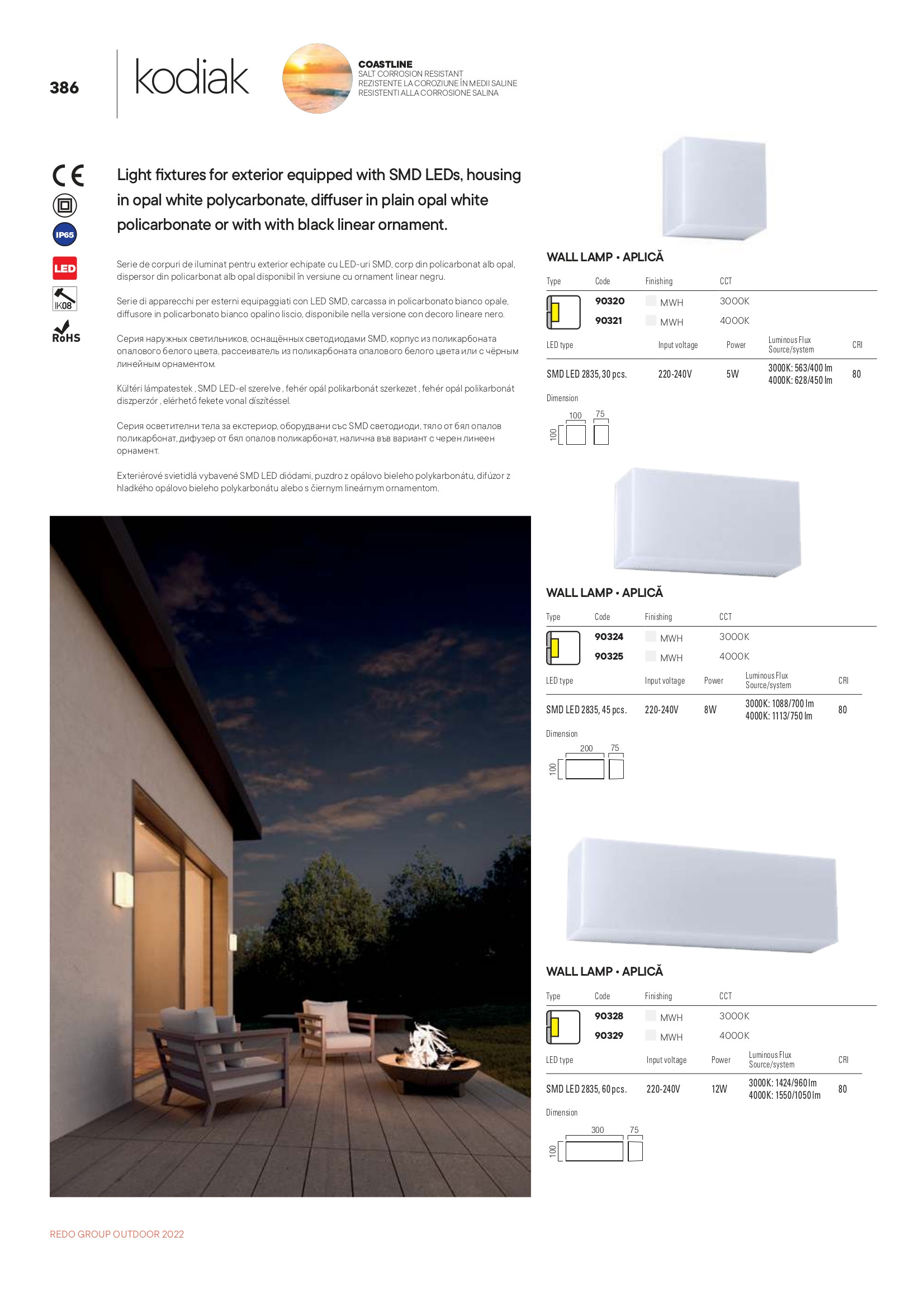 Лед аплик, външна лампа 90324 ще осигури комфорт и естетика във всяко помещение, в което се постави. Цялостната визия и дизайн на led лампата и вложените в изработката й материали, като тяло и дифузер от полимер в опалово бял цвят, материалът издържа на солена (морска) корозия , ще допринесат за един неповторим стил. Благодарение на дългогодишния опит в производството на лед осветление, качествените материали и строгия контрол на качеството на изработка на дизайнерската линия Redo Outdoor на производителя Redo (Румъния), 90324 е на високо европейско ниво.