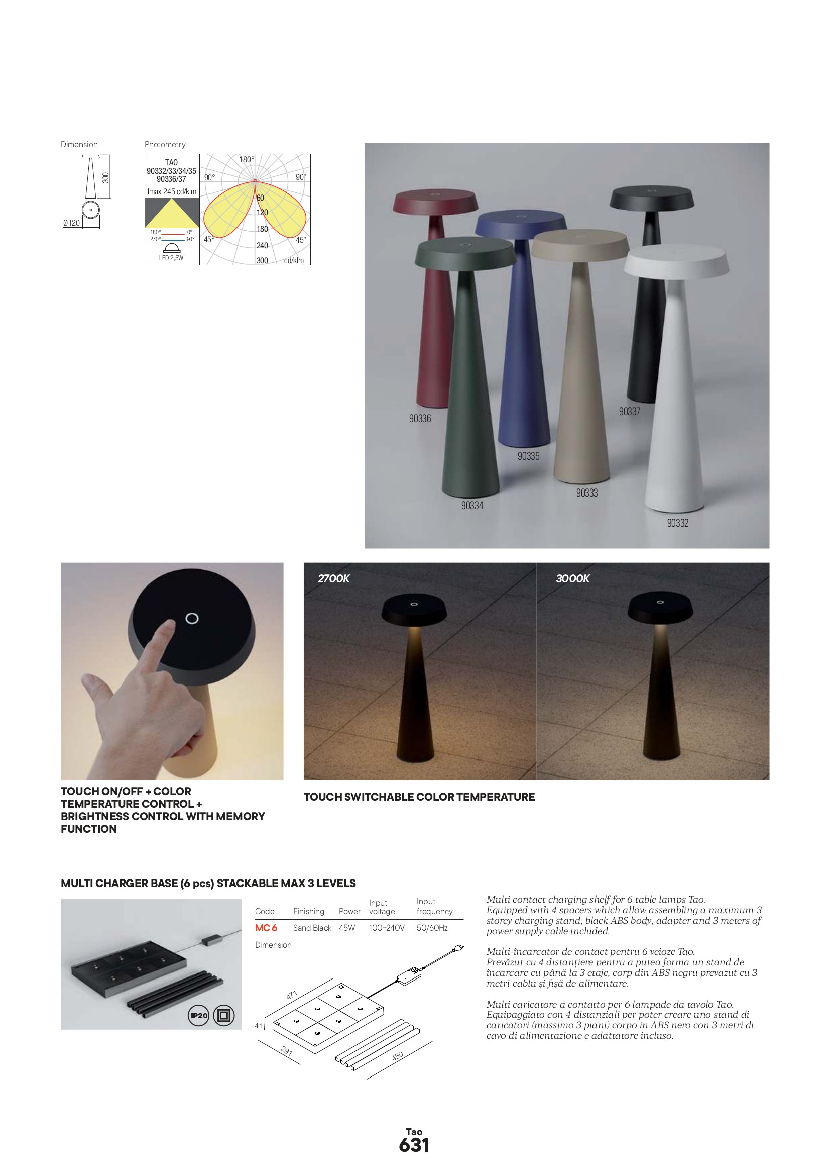 лят под налягане алуминий в цвят пурпурно червено, ON/OFF ключ, димер 5-100%, смяна на цветната температура 2700-3000К, Li-ion батерия 4400mA със защита от презареждане, микро USB гнездо, кабел и адаптер 100-240VAC/5VDC, 1A, време на зареждане до 6.5h