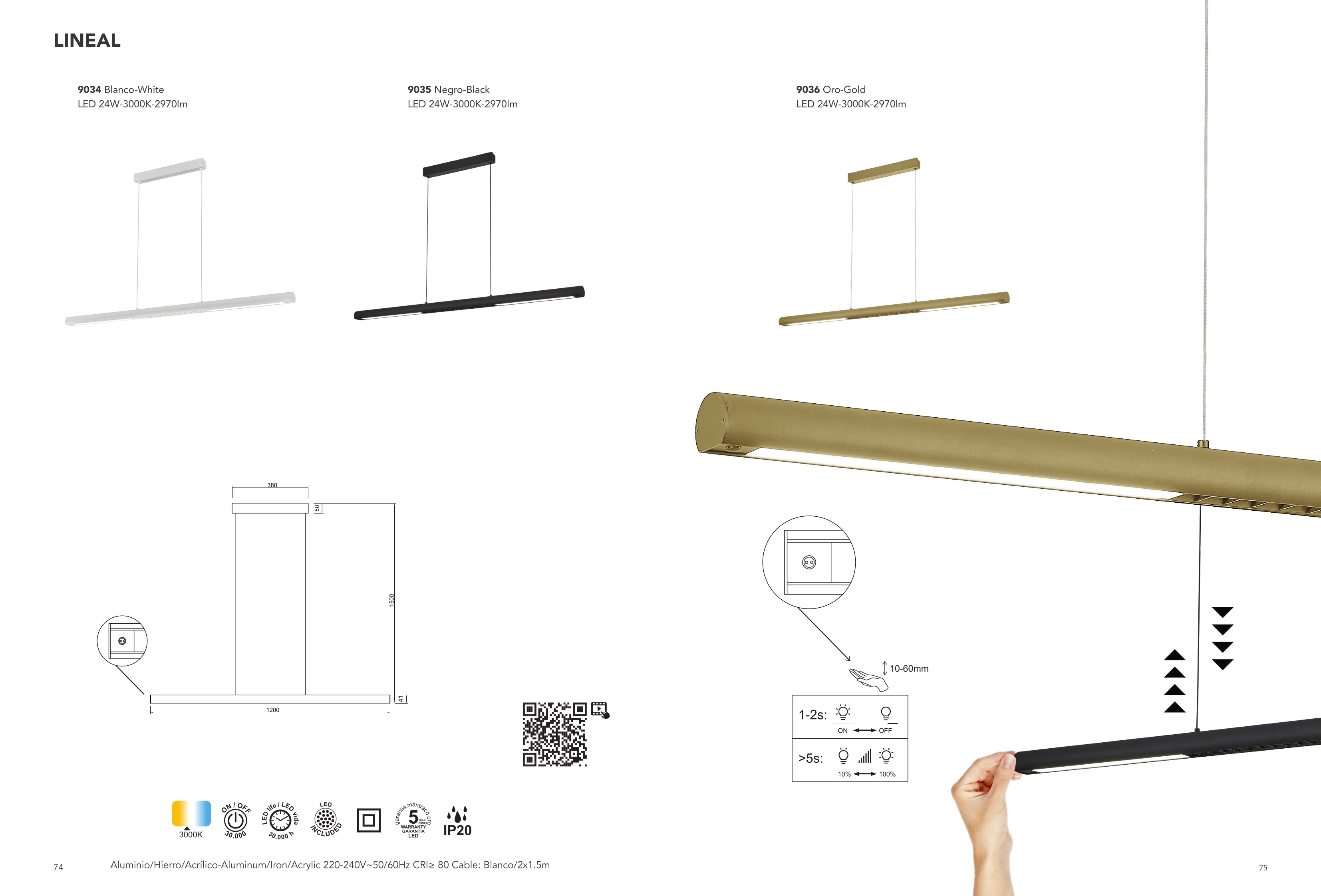 Осветителното тяло 9034 Pend 24W/3000K White ще осигури комфорт и естетика във всяко помещение, в което се постави. Цялостната визия и дизайн на лампата и вложените в изработката й материали, като алуминий и стомана в цвят злато, акрил в бяло, регулиране на силата на светлината и изключване чрез приближаване на ръка към осветителното тяло, регулируема височина, ще допринесат за един неповторим стил. Благодарение на дългогодишния опит, качествените материали и строгия контрол на качеството на изработка на производителя Mantra (Испания), 9034 Pend 24W/3000K White е на високо европейско ниво.