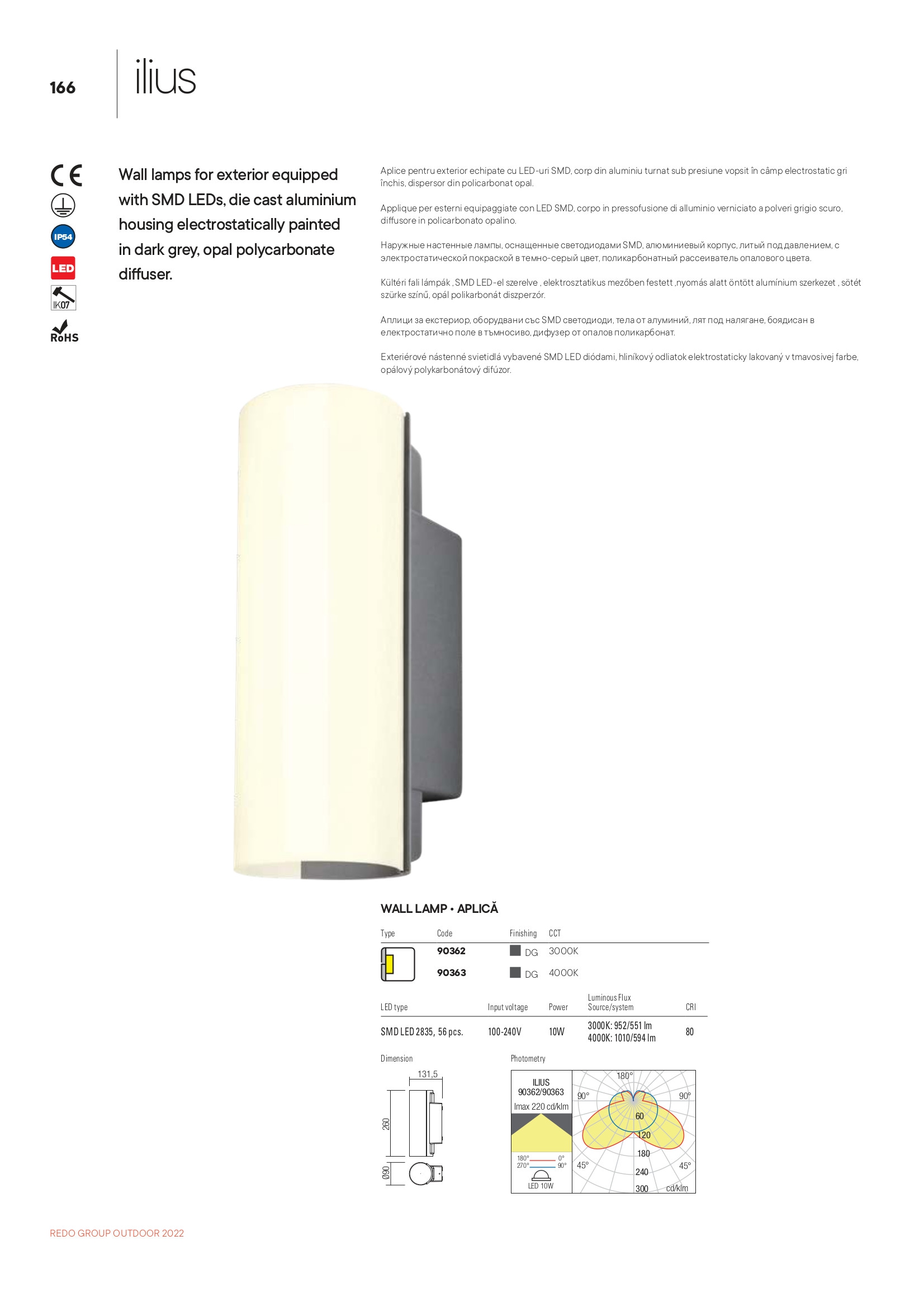 Осветителното тяло 90362 ще осигури комфорт и естетика във всяко помещение, в което се постави. Цялостната визия и дизайн на лампата и вложените в изработката й материали, като алуминий отлят под налягане в тъмно сив цвят, дифузери от полимер в цвят бял опал, ще допринесат за един неповторим стил. Благодарение на дългогодишния опит, качествените материали и строгия контрол на качеството на изработка на дизайнерската линия Redo Outdoor на производителя Redo (Румъния), 90362 е на високо европейско ниво.
