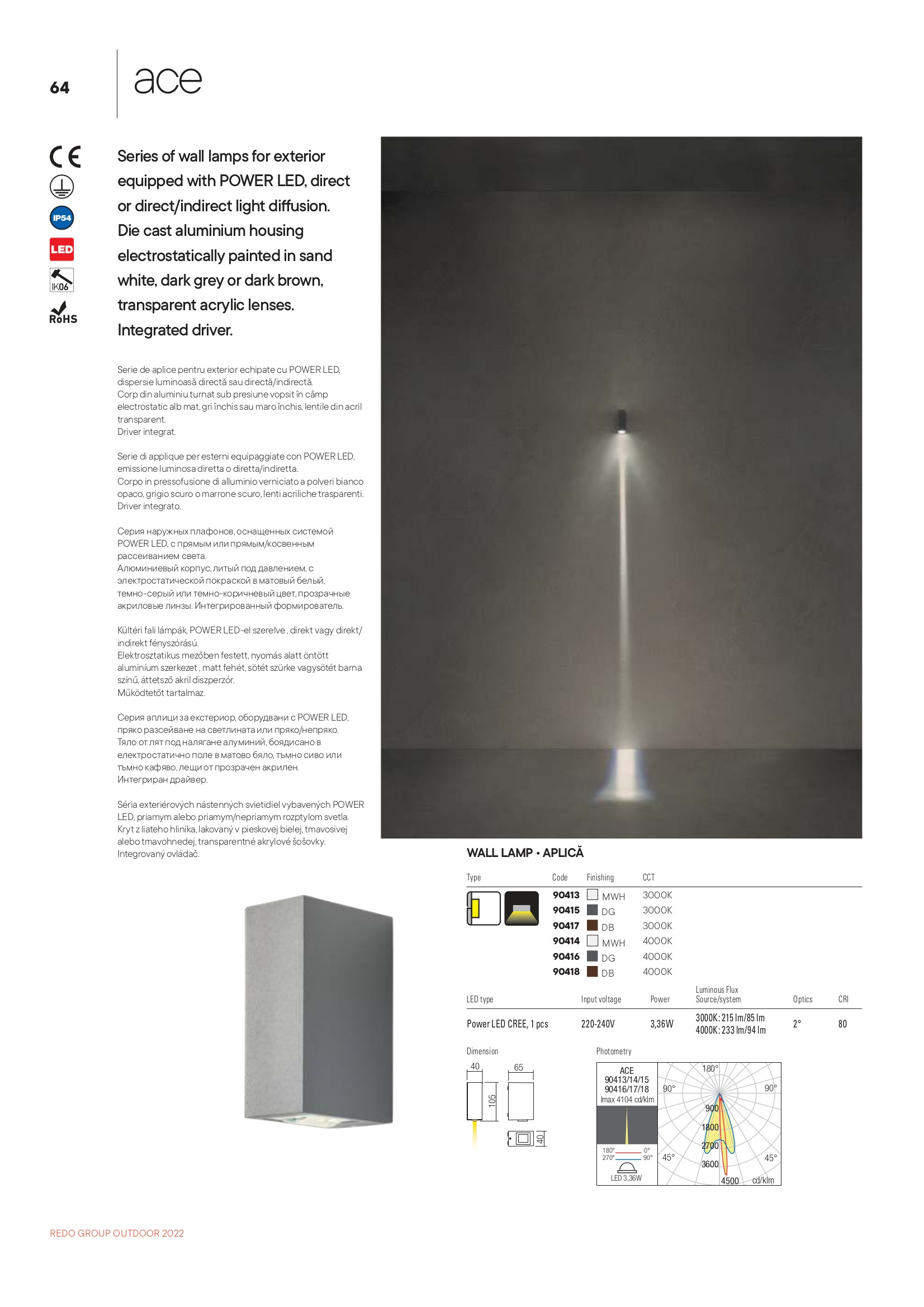 Лед аплик, външна лампа 90413 ще осигури комфорт и естетика във всяко помещение, в което се постави. Цялостната визия и дизайн на led лампата и вложените в изработката й материали, като лят под налягане алуминий в матово бяло, леща от прозрачен полимер, ще допринесат за един неповторим стил. Благодарение на дългогодишния опит в производството на лед осветление, качествените материали и строгия контрол на качеството на изработка на дизайнерската линия Redo Outdoor на производителя Redo (Румъния), 90413 е на високо европейско ниво.