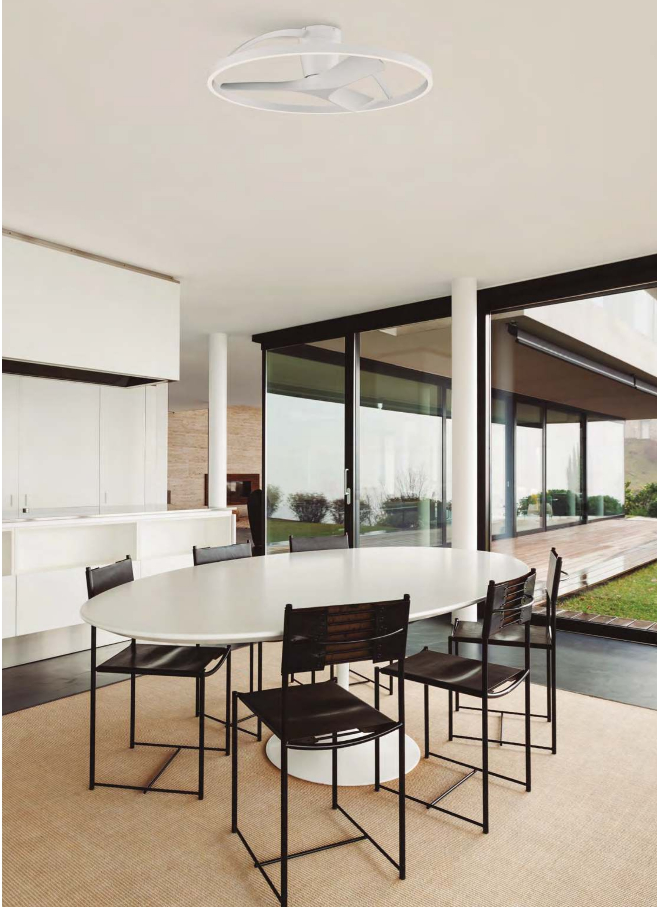 метал в бял цвят, полимер (ABS) в бяло, дифузьор от полимер в бяло, DC мотор 32W, димиране, смяна на цветната температура (2700К-5000К), посоката и скоростта на въртене чрез дистанционно, включено в комплекта
