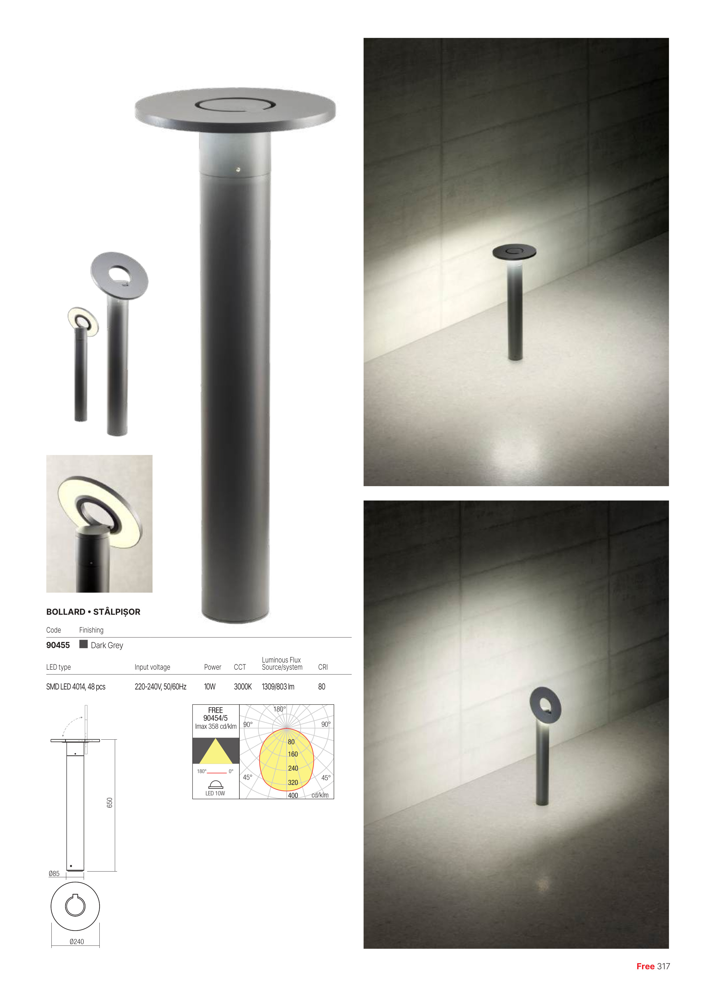 Осветителното тяло 90455 ще осигури комфорт и естетика във всяко помещение, в което се постави. Цялостната визия и дизайн на лампата и вложените в изработката й материали, като алуминий излят под налягане, с нанесено в електростатично поле тъмно сиво покритие, опалово бял поликарбонатен дифузер, възможност за накланяне на сенника до 90°, ще допринесат за един неповторим стил. Благодарение на дългогодишния опит, качествените материали и строгия контрол на качеството на изработка на дизайнерската линия Redo Indoor на производителя Redo (Румъния), 90455 е на високо европейско ниво.