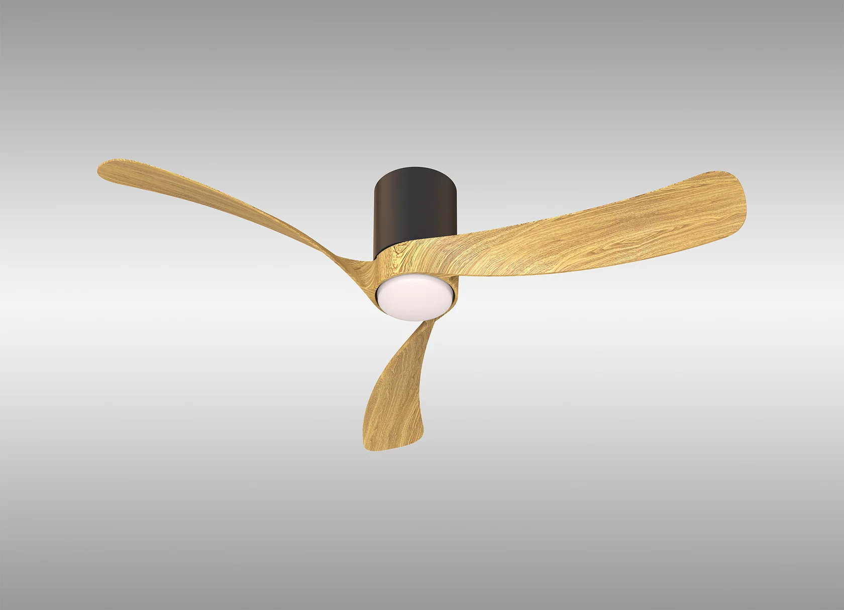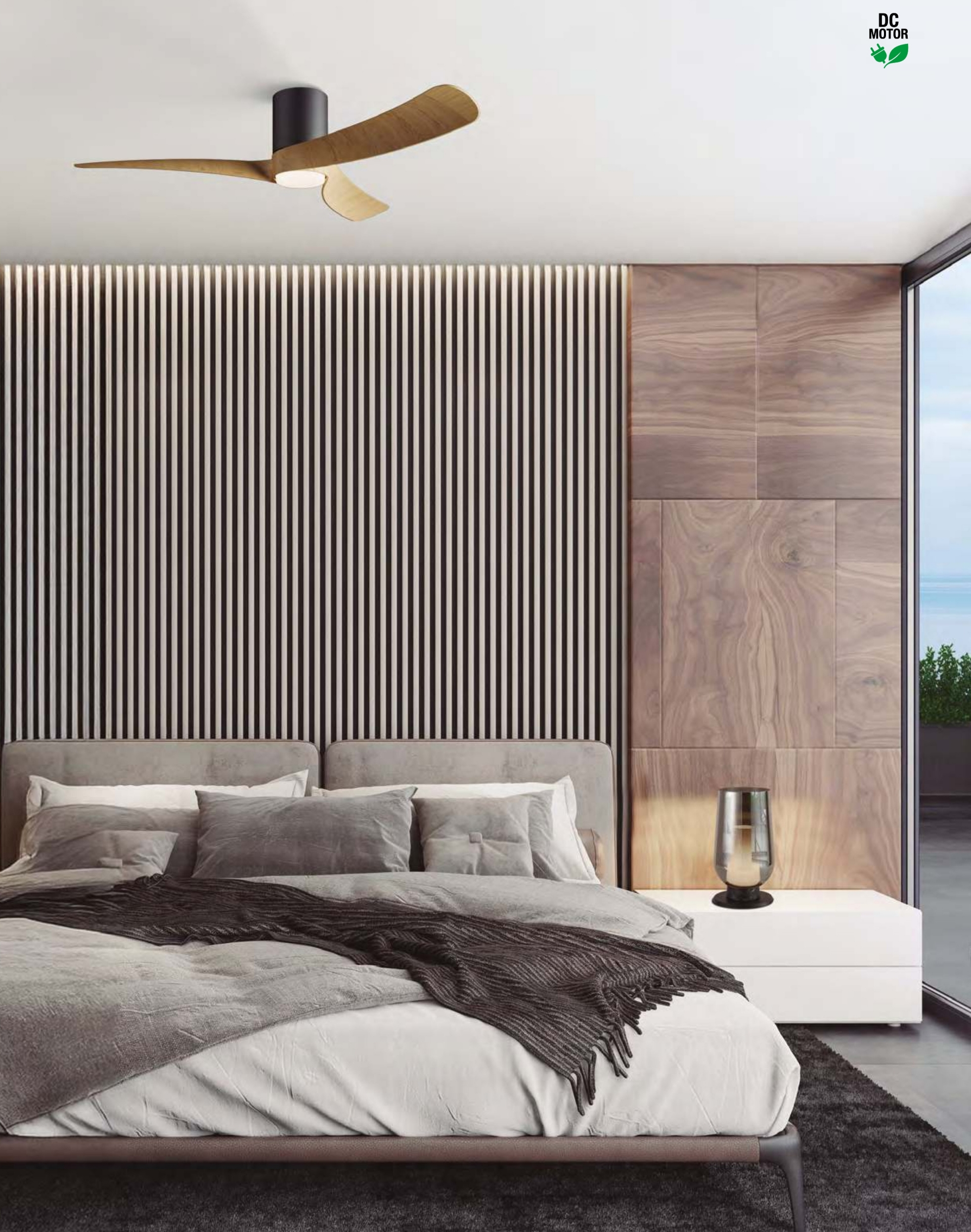 метал в черен цвят, дифузьор от силикон, перки от MDF в цвят дърво, дистанционно за управление на вентилатора, цветната температура и димиране, вентилатор с DC двигател 32W