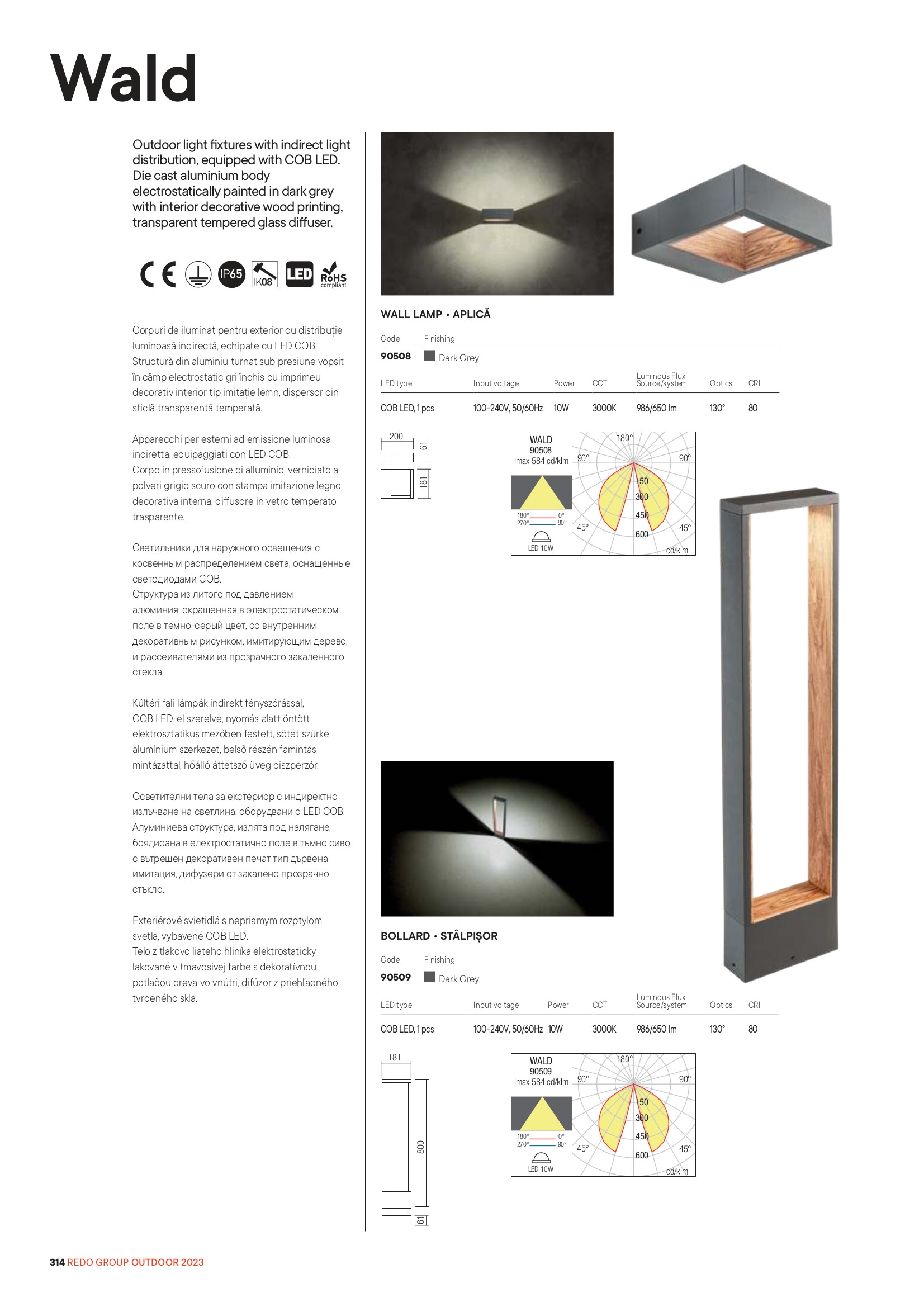 Осветителното тяло 90509 ще осигури комфорт и естетика във всяко помещение, в което се постави. Цялостната визия и дизайн на лампата и вложените в изработката й материали, като алуминиево тяло, излято под налягане, с нанесено в електростатично поле, покритие в тъмно сив цвят, вътрешната част е с декоративен печат имитиращ дърво дифузер от закалено прозрачно стъкло, ще допринесат за един неповторим стил. Благодарение на дългогодишния опит, качествените материали и строгия контрол на качеството на изработка на дизайнерската линия Redo Outdoor на производителя Redo (Румъния), 90509 е на високо европейско ниво.