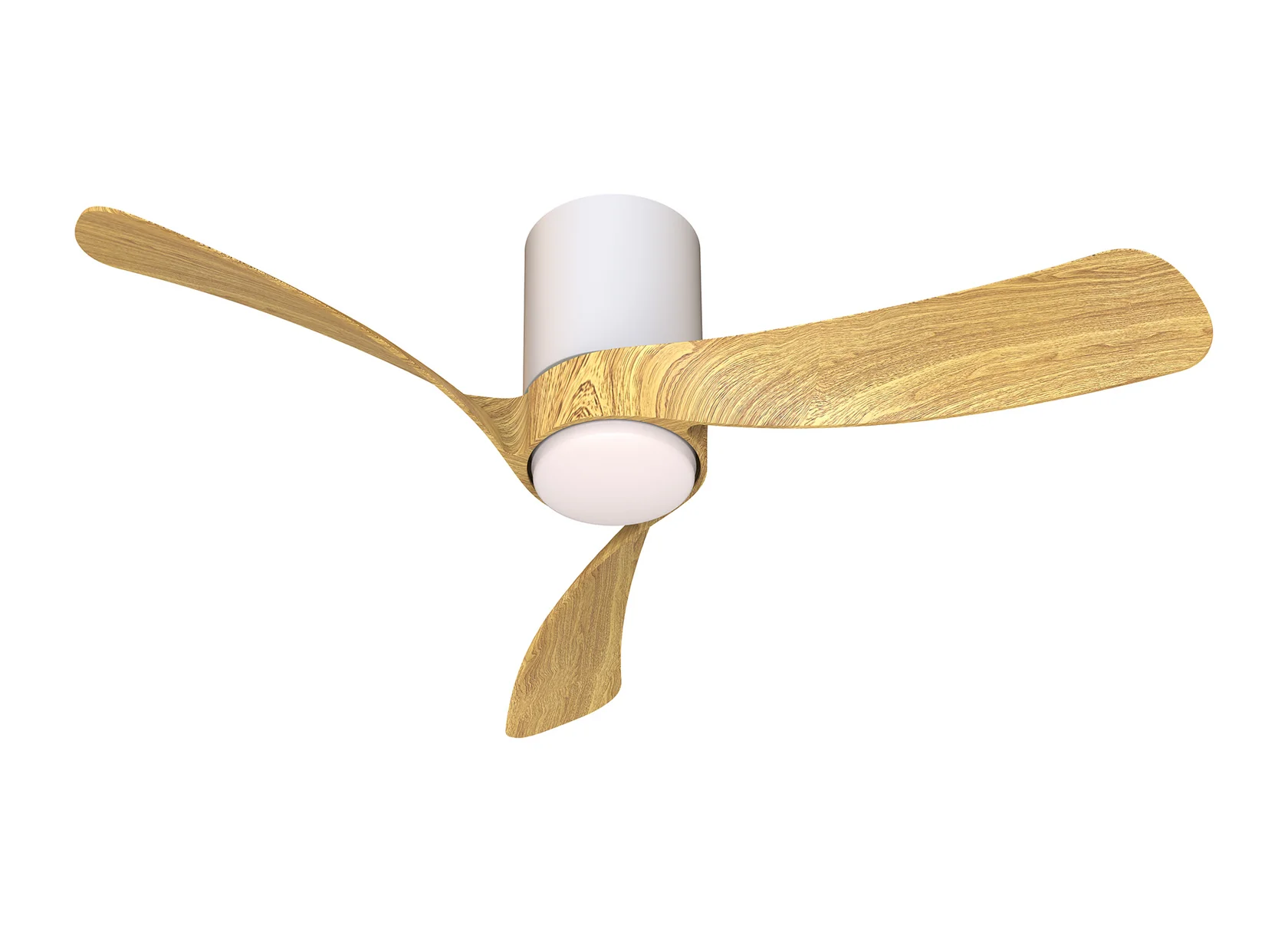 метал в бял цвят, дифузьор от силикон, перки от MDF в цвят дърво, дистанционно за управление на вентилатора, цветната температура и димиране, вентилатор с DC двигател 30W
