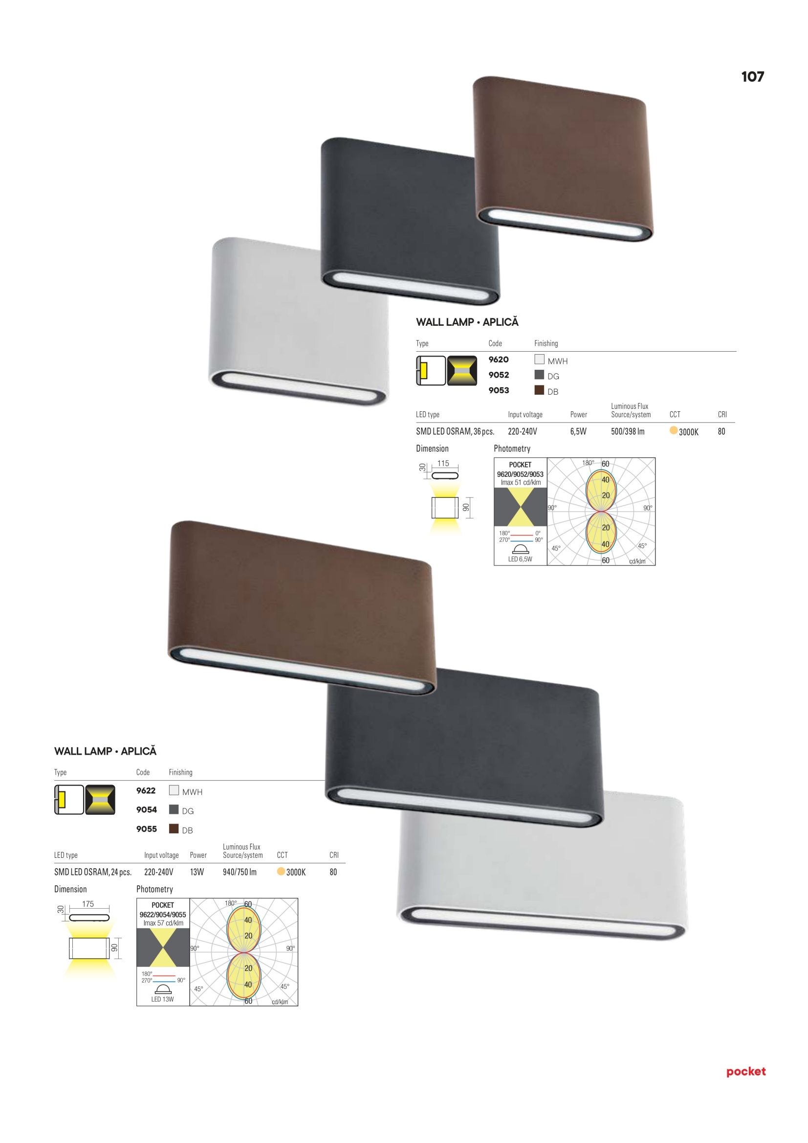 Осветителното тяло 9052 представлява аплик, външна лампа в съвременен стил. 9052 е от категорията осветителни тела и е подходящо за осветяване на различни помещения и пространства като: външно осветление, фасадно осветление.