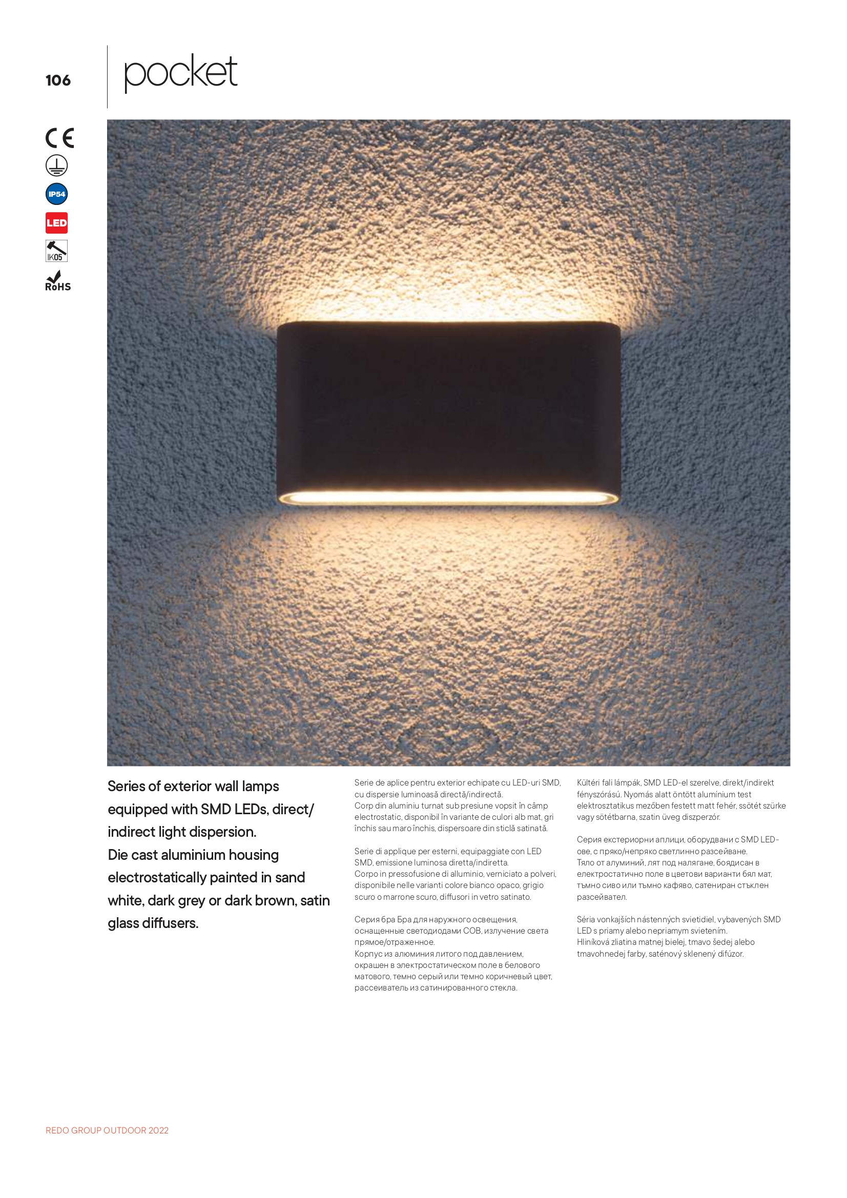 Осветителното тяло 9053 ще осигури комфорт и естетика във всяко помещение, в което се постави. Цялостната визия и дизайн на лампата и вложените в изработката й материали, като алуминиев корпус лят под налягане с електростатично нанесено покритие в тъмно кафяв цвят, дифузер от сатенирано стъкло, ще допринесат за един неповторим стил. Благодарение на дългогодишния опит, качествените материали и строгия контрол на качеството на изработка на дизайнерската линия Redo Outdoor на производителя Redo (Румъния), 9053 е на високо европейско ниво.