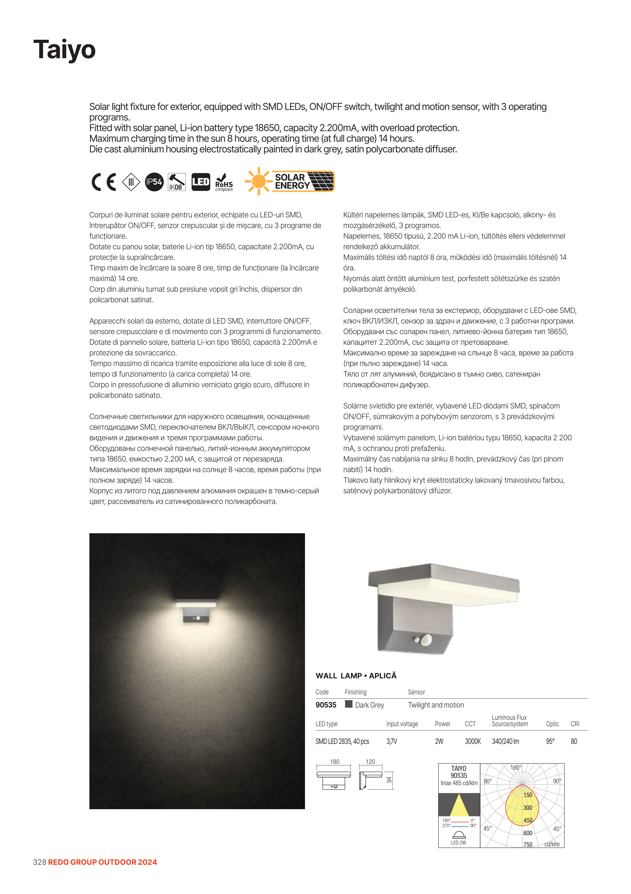Лед аплик, външна лампа 90535 ще осигури комфорт и естетика във всяко помещение, в което се постави. Цялостната визия и дизайн на led лампата и вложените в изработката й материали, като отлят алуминий в тъмно сиво, сатениран поликарбонатен дифузер, соларно осветително тяло със сензори за здрач и движение със соларен панел и Li-ion батерия 3,7V, ще допринесат за един неповторим стил. Благодарение на дългогодишния опит в производството на лед осветление, качествените материали и строгия контрол на качеството на изработка на дизайнерската линия Redo Outdoor на производителя Redo (Румъния), 90535 е на високо европейско ниво.