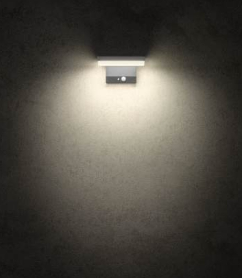 отлят алуминий в тъмно сиво, сатениран поликарбонатен дифузер, соларно осветително тяло със сензори за здрач и движение със соларен панел и Li-ion батерия 3,7V