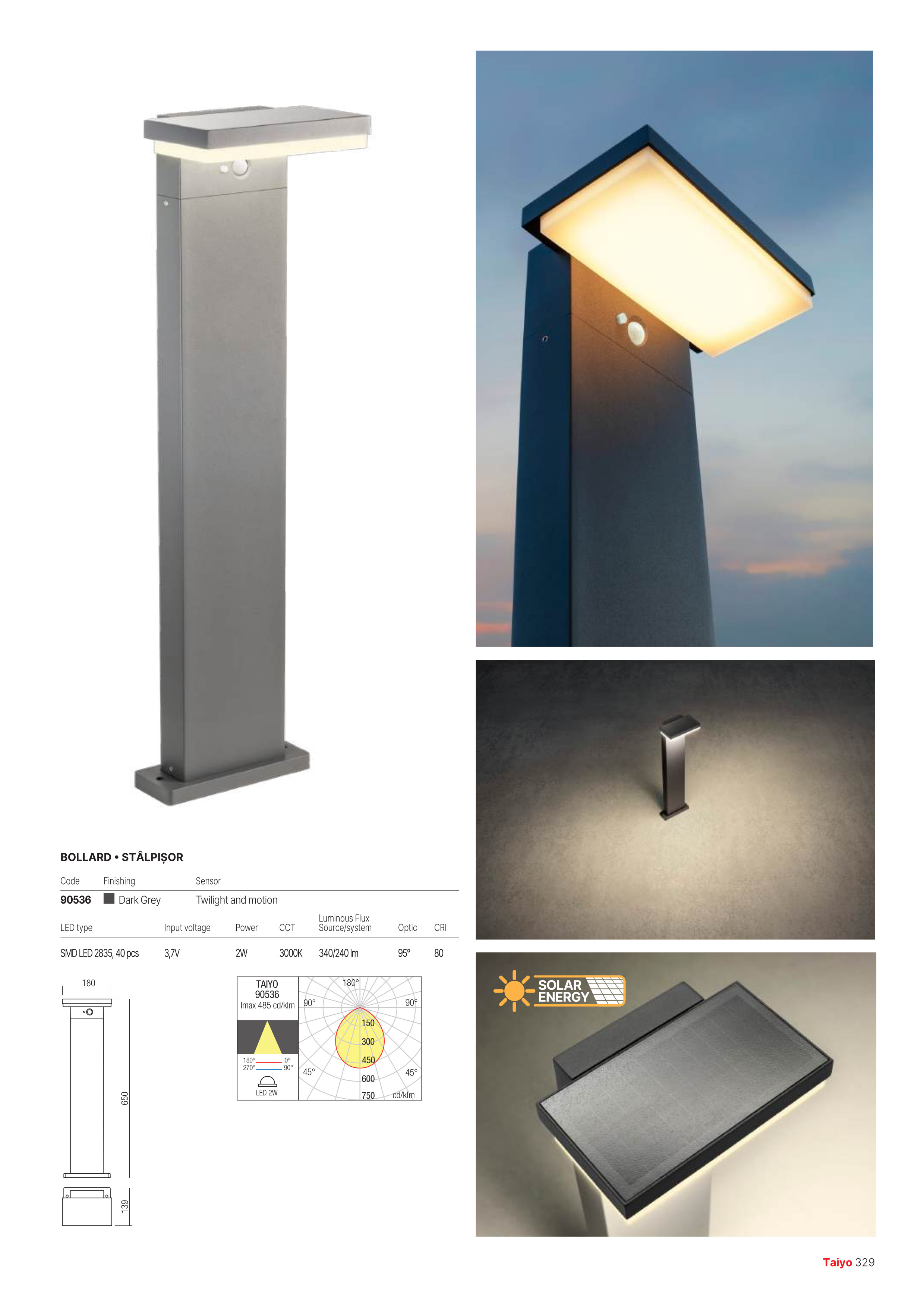 Лед външна лампа 90536 ще осигури комфорт и естетика във всяко помещение, в което се постави. Цялостната визия и дизайн на led лампата и вложените в изработката й материали, като отлят алуминий в тъмно сиво, сатениран поликарбонатен дифузер, соларно осветително тяло със сензори за здрач и движение със соларен панел и Li-ion батерия 3,7V, ще допринесат за един неповторим стил. Благодарение на дългогодишния опит в производството на лед осветление, качествените материали и строгия контрол на качеството на изработка на дизайнерската линия Redo Outdoor на производителя Redo (Румъния), 90536 е на високо европейско ниво.