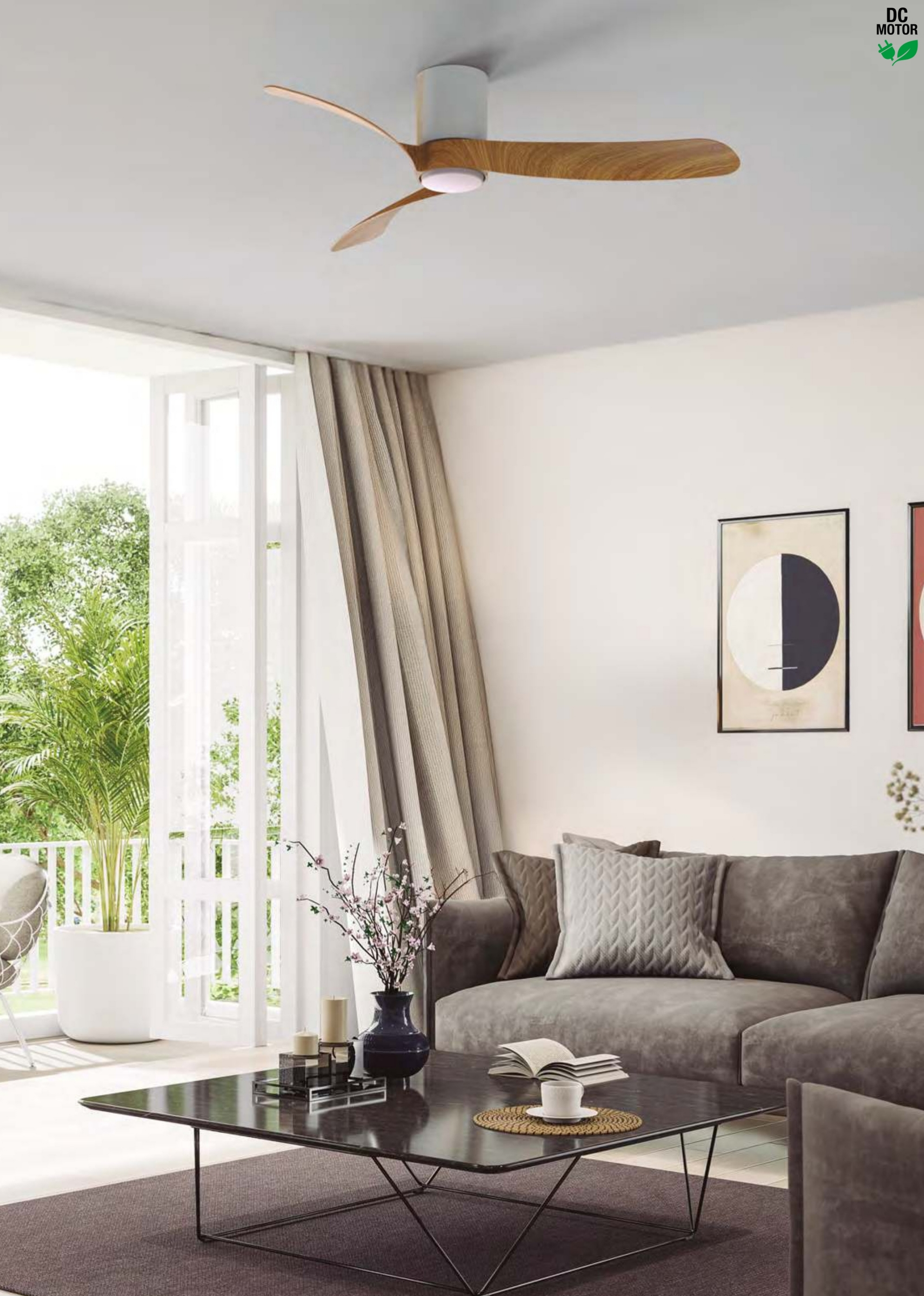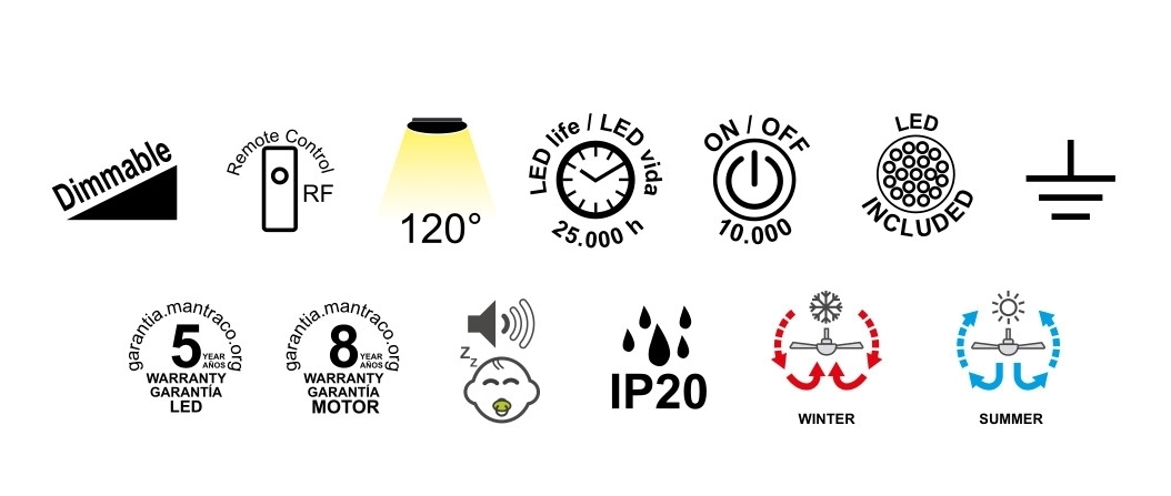 метал в бял цвят, дифузьор от силикон, перки от MDF в цвят дърво, дистанционно за управление на вентилатора, цветната температура и димиране, вентилатор с DC двигател 26W