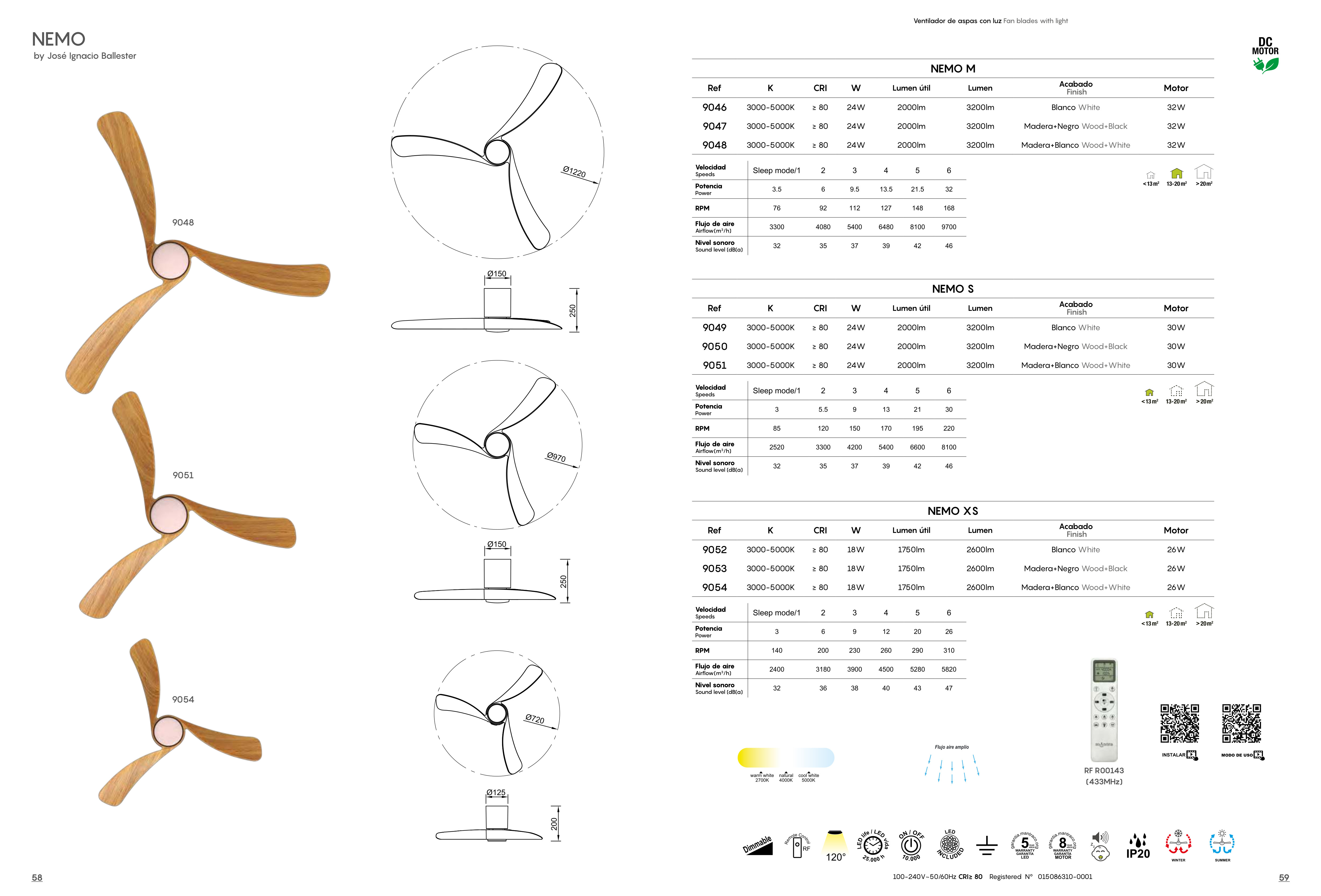 Лед плафон 9054 White+ImmitationWood 20W 2700K-5000K NEMO XS ще осигури комфорт и естетика във всяко помещение, в което се постави. Цялостната визия и дизайн на led лампата и вложените в изработката й материали, като метал в бял цвят, дифузьор от силикон, перки от MDF в цвят дърво, дистанционно за управление на вентилатора, цветната температура и димиране, вентилатор с DC двигател 26W, ще допринесат за един неповторим стил. Благодарение на дългогодишния опит в производството на лед осветление, качествените материали и строгия контрол на качеството на изработка на производителя Mantra (Испания), 9054 White+ImmitationWood 20W 2700K-5000K NEMO XS е на високо европейско ниво.