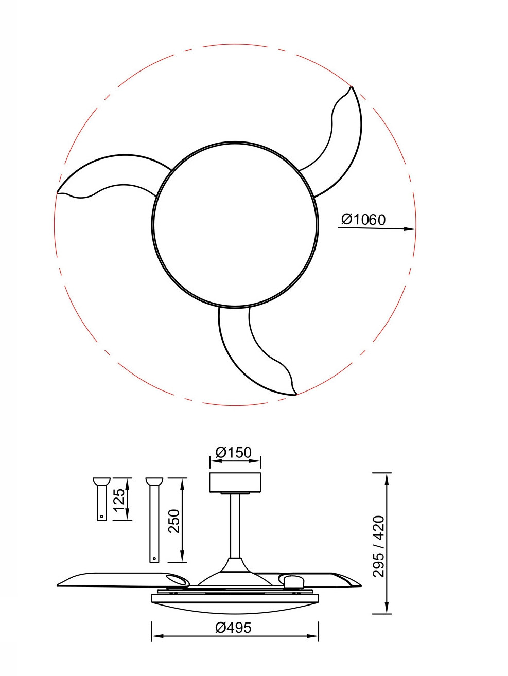 полимер в черен цвят, дифузер в бял цвят, прозрачни перки, контрол с дистанционно, DC двигател на вентилатора 30W, функция лято/зима, ССТ 2700-5000К