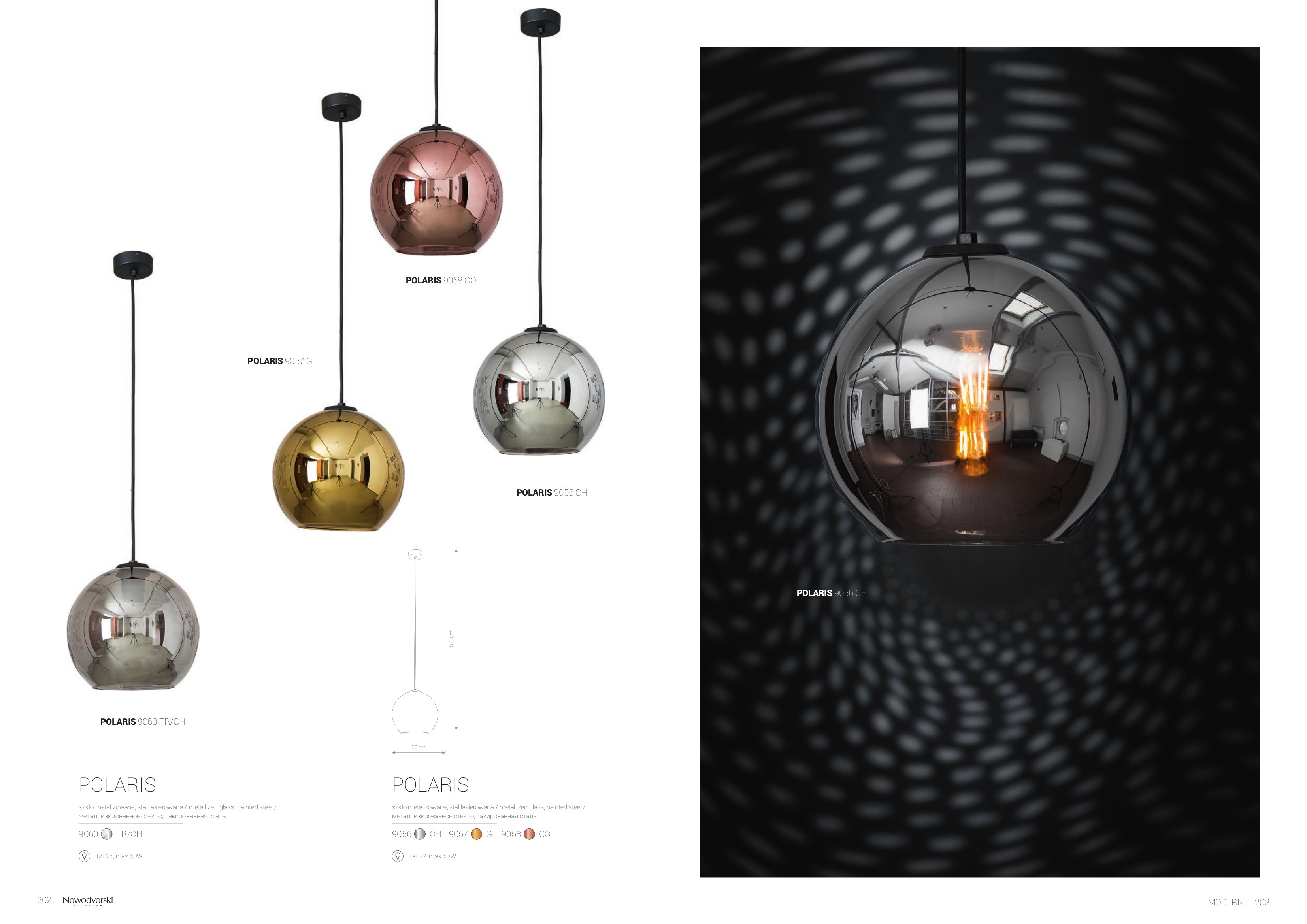 Осветителното тяло 9057 POLARIS GOLD ще осигури комфорт и естетика във всяко помещение, в което се постави. Цялостната визия и дизайн на лампата и вложените в изработката й материали, като основа от стомана в черен цвят, сферичен стъклен дифузер в златист нюанс, ще допринесат за един неповторим стил. Благодарение на дългогодишния опит, качествените материали и строгия контрол на качеството на изработка на производителя Nowodvorski (Полша), 9057 POLARIS GOLD е на високо европейско ниво.