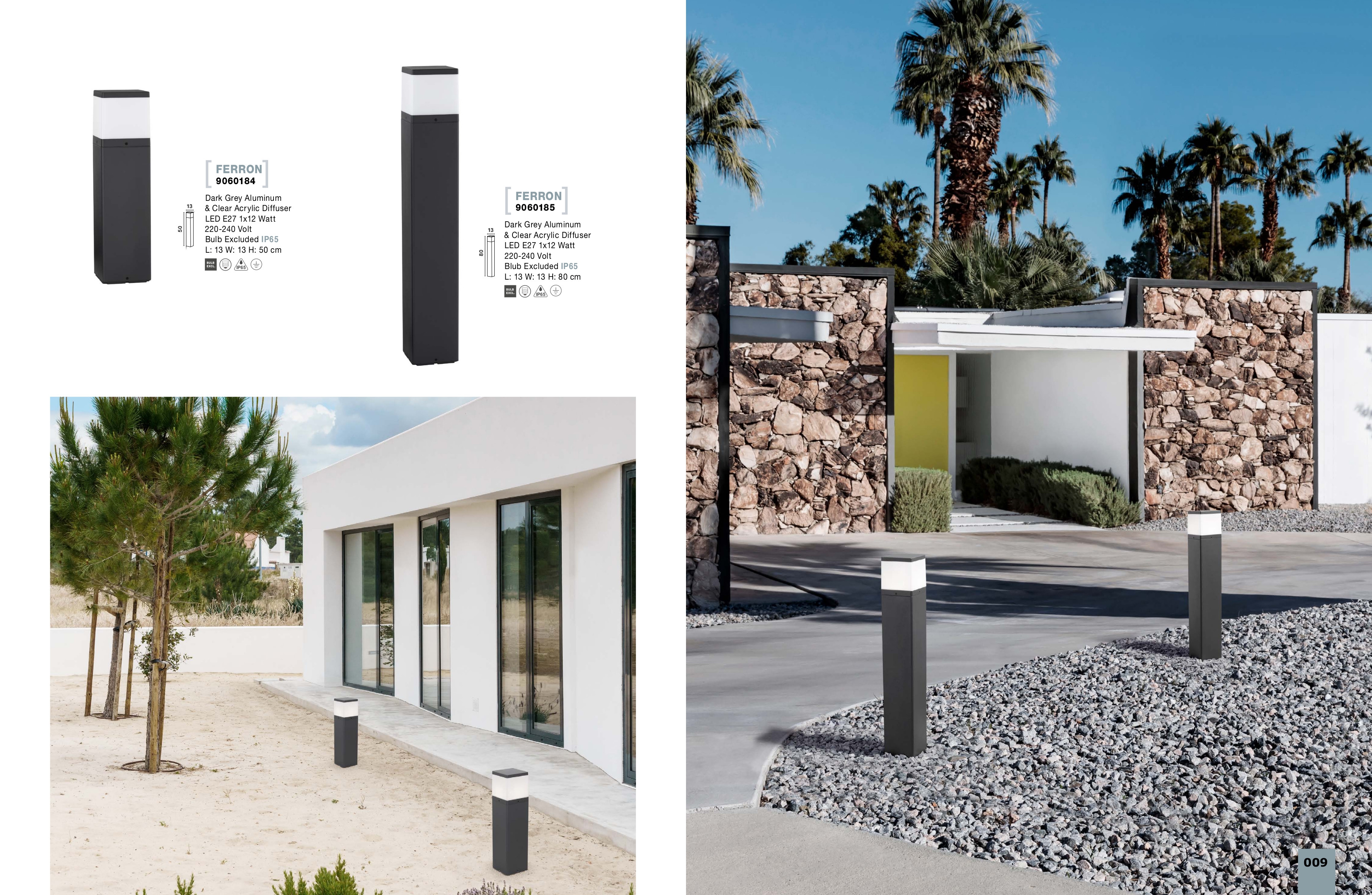 Осветителното тяло 9060185 представлява външна лампа в съвременен стил. 9060185 е от категорията осветителни тела и е подходящо за осветяване на различни помещения и пространства като: градинско осветление, външно осветление.