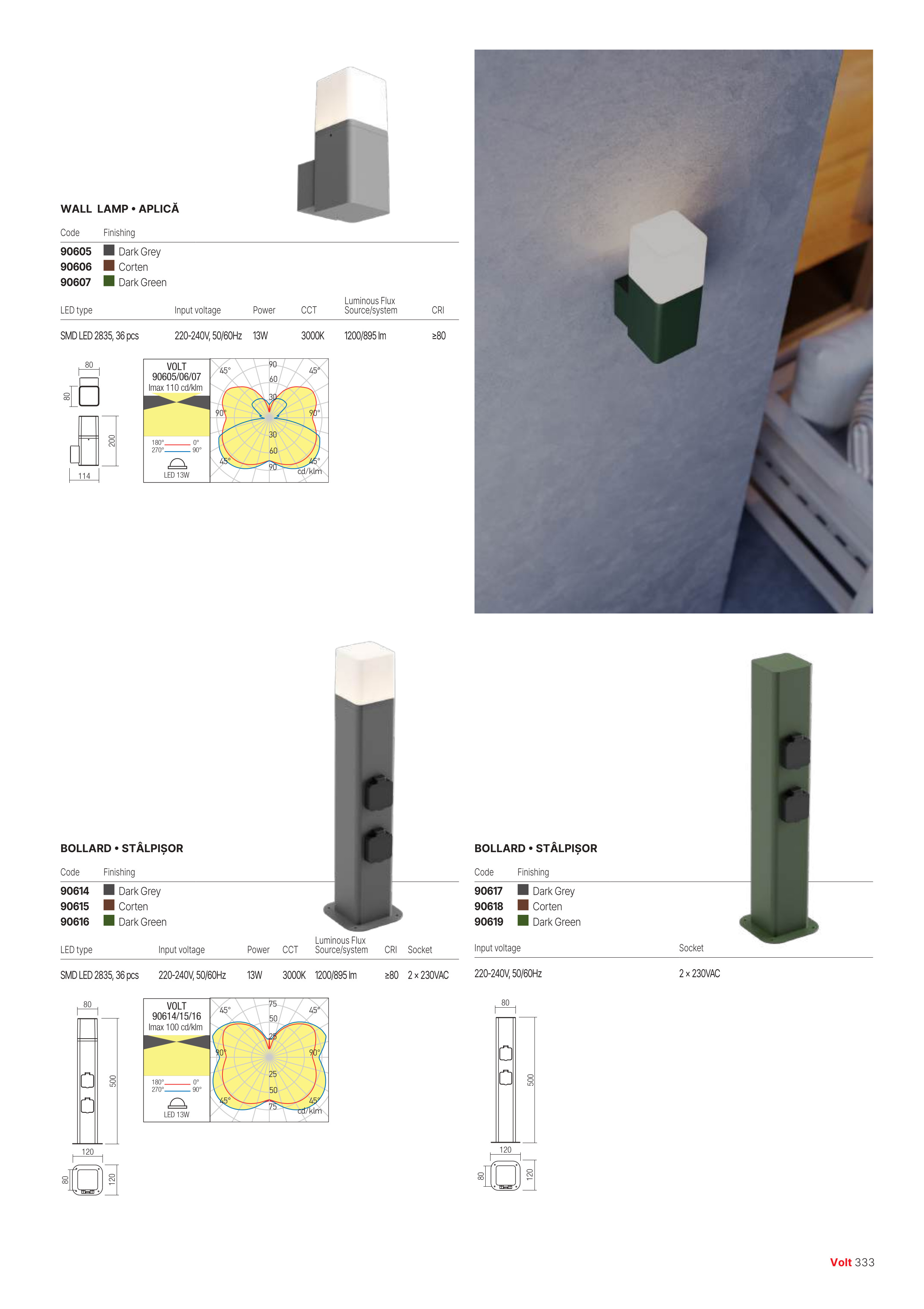 алуминий, излят под налягане, с нанесено в електростатично поле покритие в цвят ръжда, дифузер от поликарбонат в опалово бяло, два водозащитени контакта 230 VAC