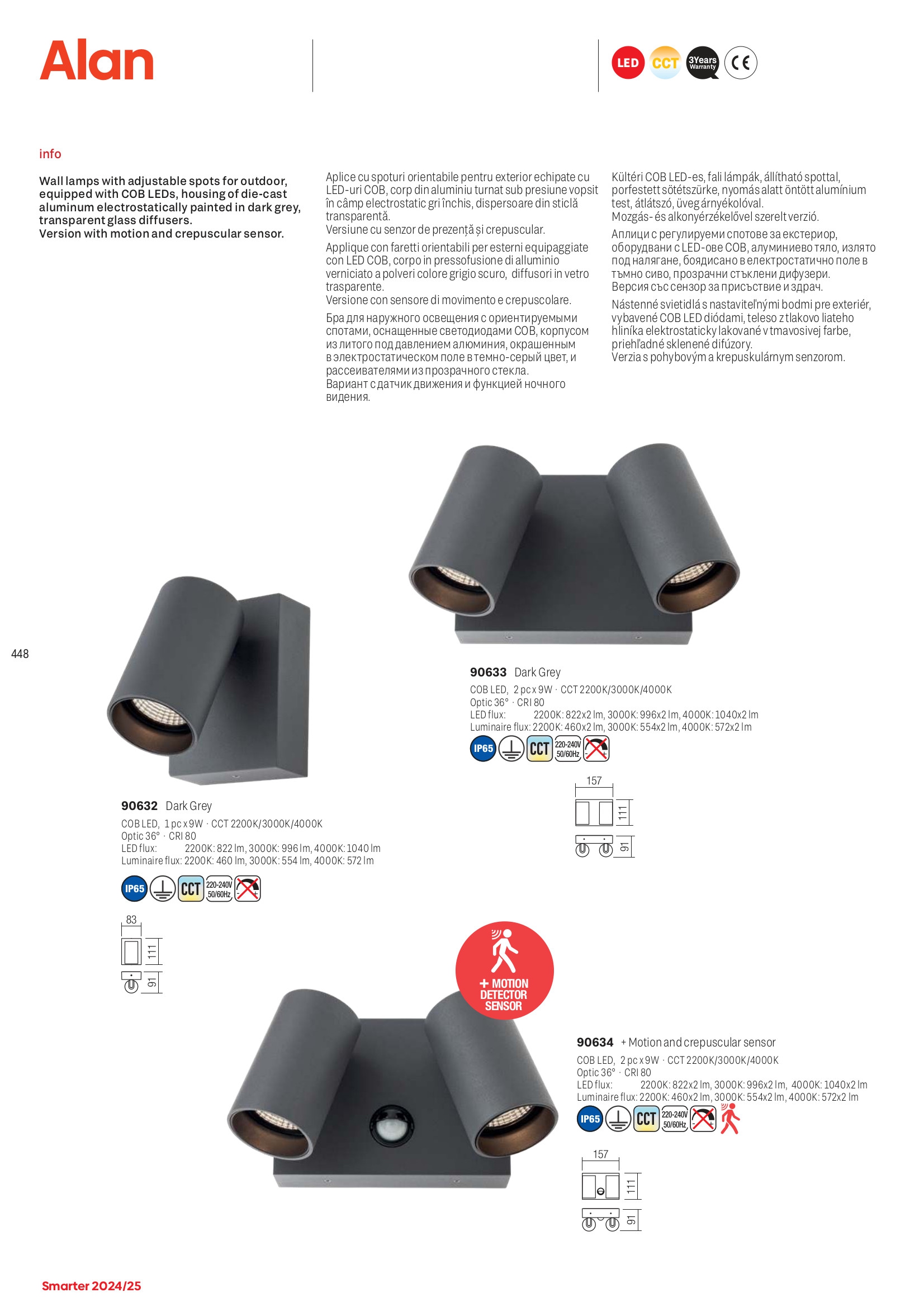 Лед външна лампа, спот лампа 90633 ще осигури комфорт и естетика във всяко помещение, в което се постави. Цялостната визия и дизайн на led лампата и вложените в изработката й материали, като алуминиево тяло излято под налягане в тъмно сив цвят, прозрачни стъклени дифузери, възможност за насочване, CCT 2200K/3000K/4000K, ще допринесат за един неповторим стил. Благодарение на дългогодишния опит в производството на лед осветление, качествените материали и строгия контрол на качеството на изработка на дизайнерската линия Redo Smarter на производителя Redo (Румъния), 90633 е на високо европейско ниво.